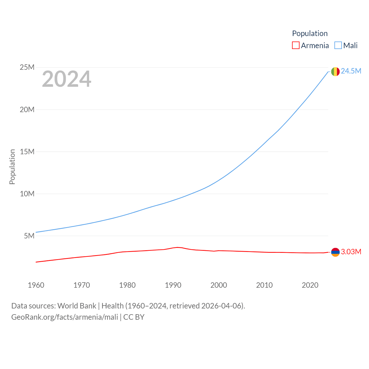 Armenia has a population of 3.03M (ranked 135/197), compared with 24.5M in Mali (ranked 58/197). Armenia's land area is 10,888 sq mi versus 471,118 sq mi for Mali (ranked 138th vs. 23rd).