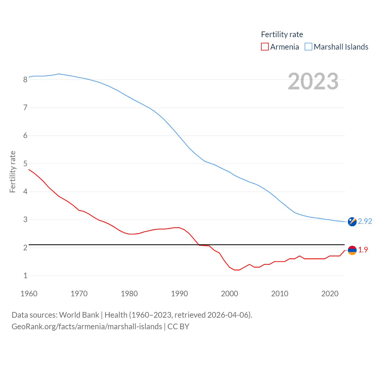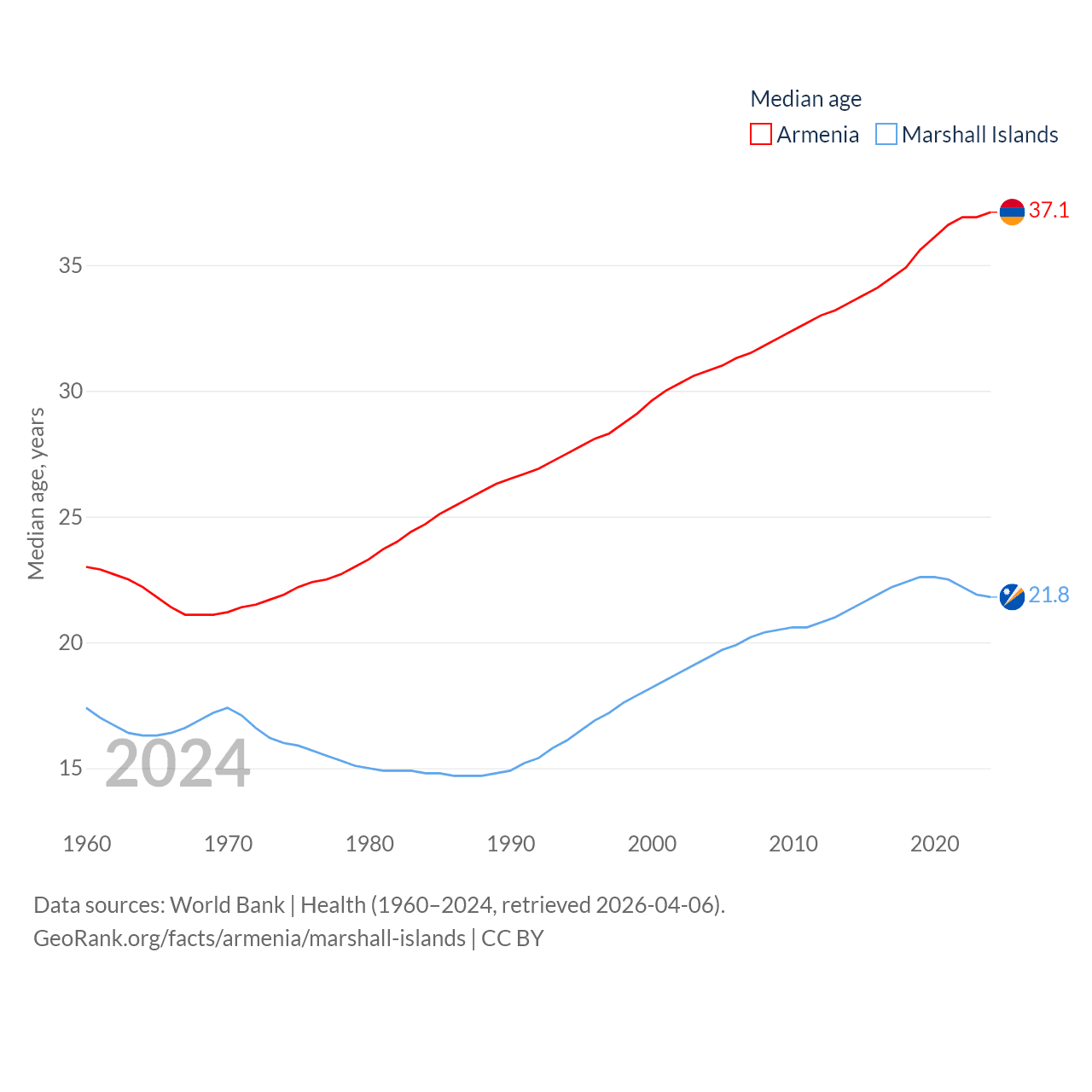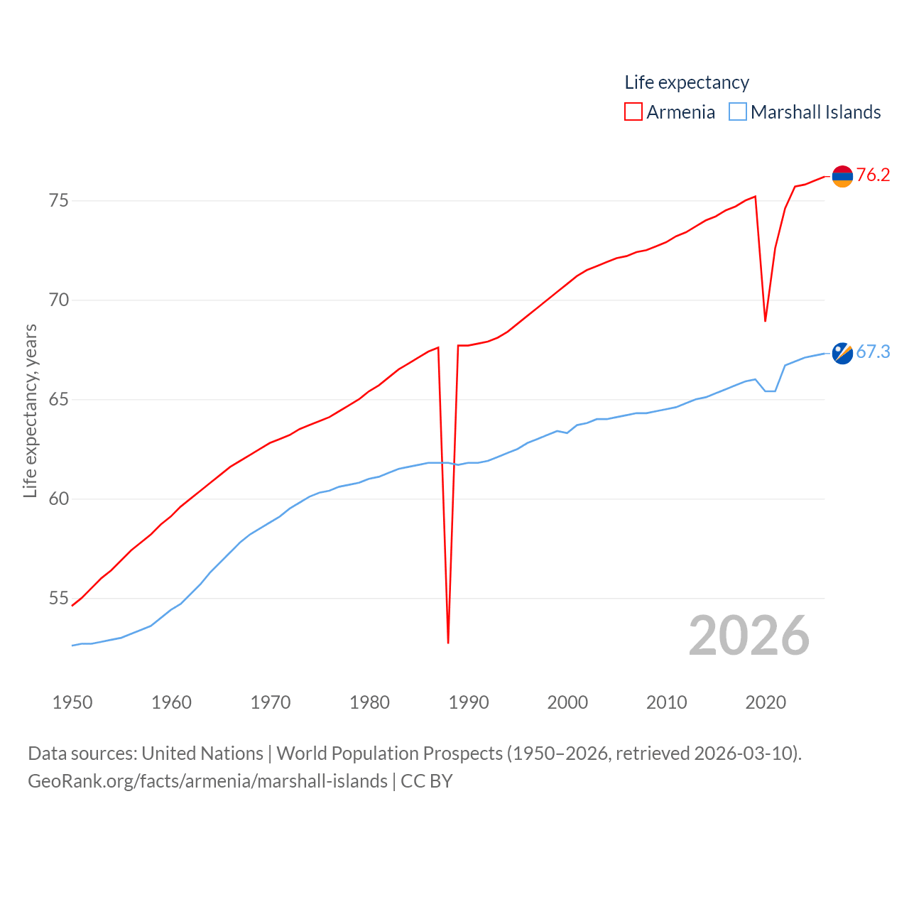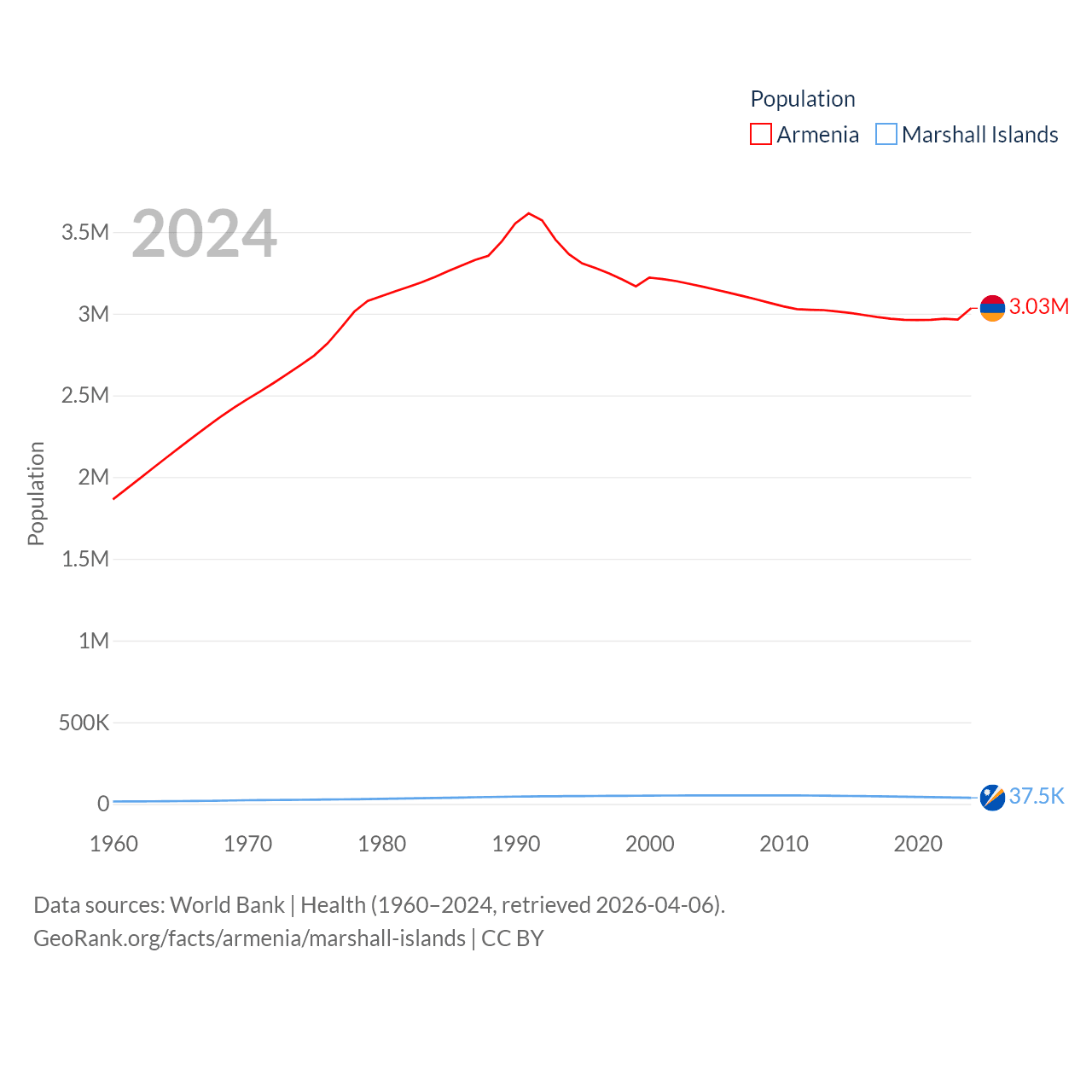Armenia has a population of 3.03M (ranked 135/197), compared with 37.5K in The Marshall Islands (ranked 192/197). Armenia's land area is 10,888 sq mi versus 69.5 sq mi for The Marshall Islands (ranked 138th vs. 191st).