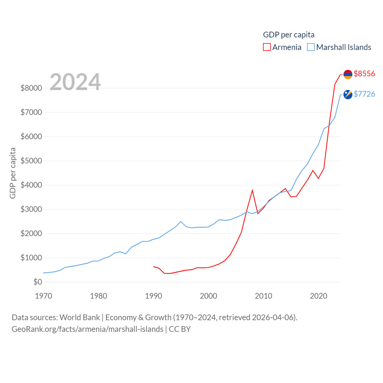 By GDP, Armenia ranks 114/197 ($26B) and The Marshall Islands ranks 193/197 ($290M). By GDP per capita, Armenia ranks 90/197 ($8,556), while The Marshall Islands ranks 96/197 ($7,726).