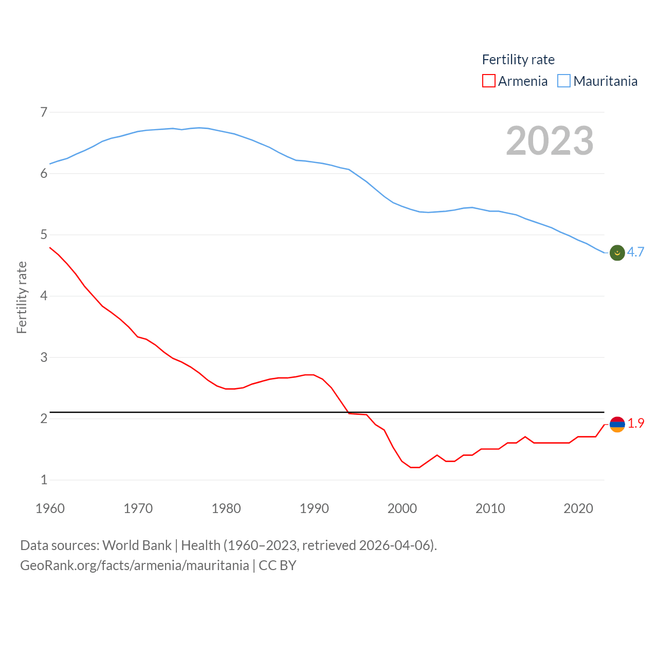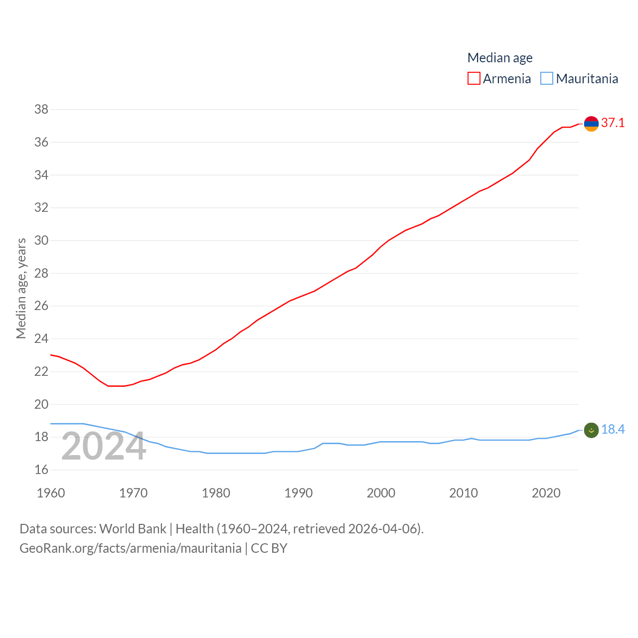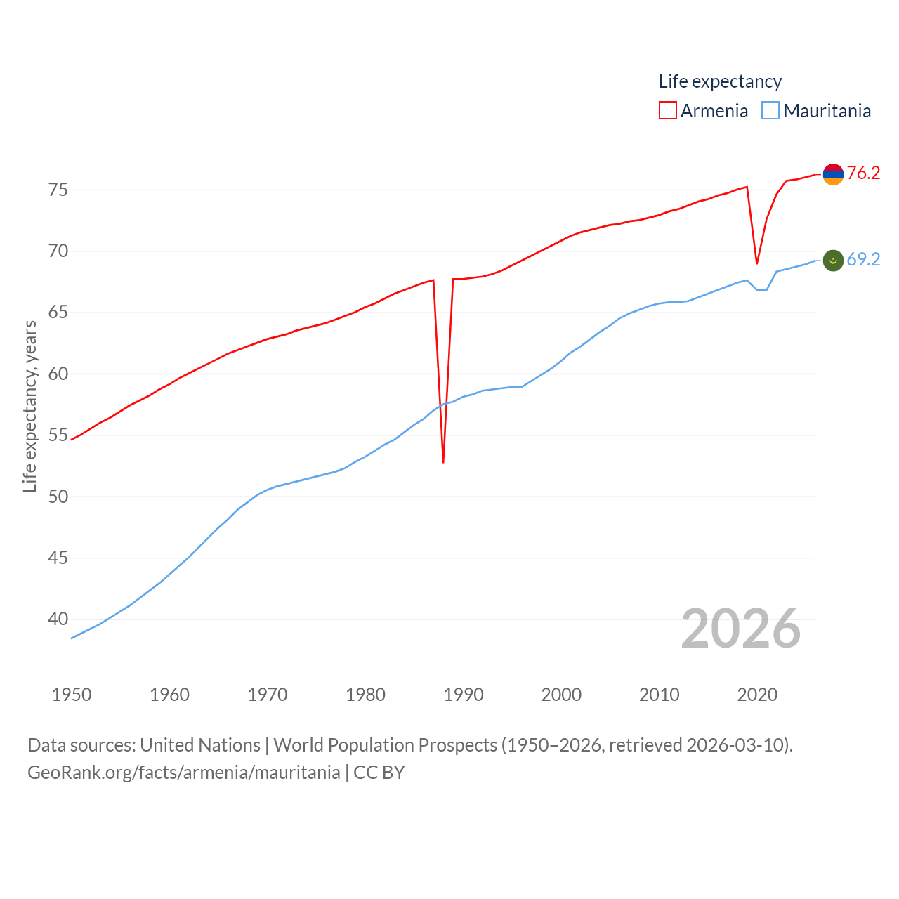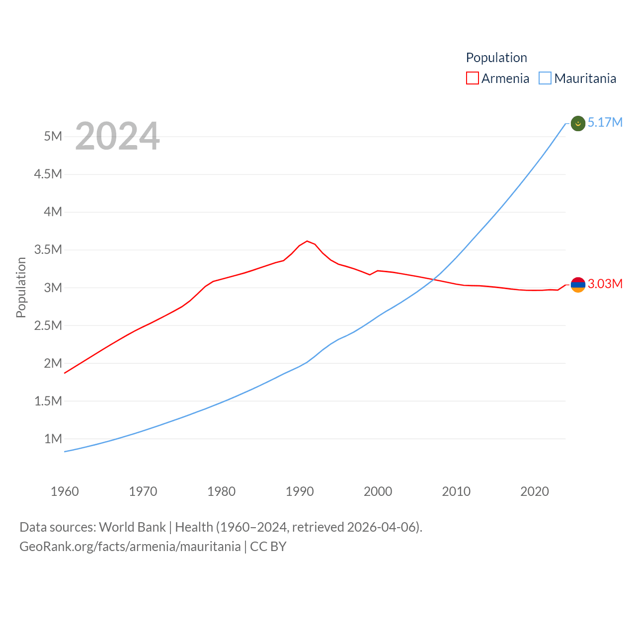 Armenia has a population of 3.03M (ranked 135/197), compared with 5.17M in Mauritania (ranked 125/197). Armenia's land area is 10,888 sq mi versus 397,955 sq mi for Mauritania (ranked 138th vs. 28th).