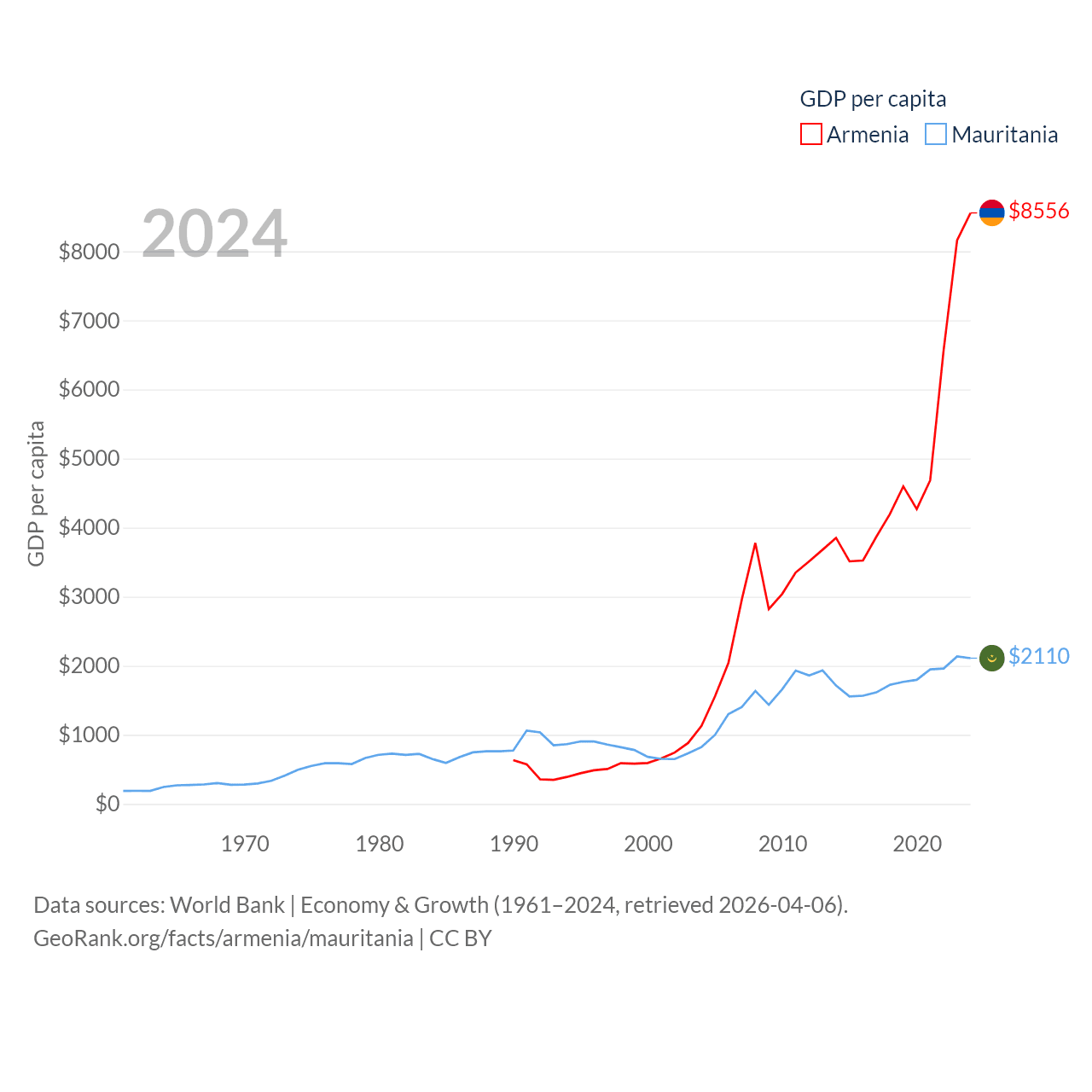 By GDP, Armenia ranks 114/197 ($26B) and Mauritania ranks 153/197 ($10.9B). By GDP per capita, Armenia ranks 90/197 ($8,556), while Mauritania ranks 156/197 ($2,110).