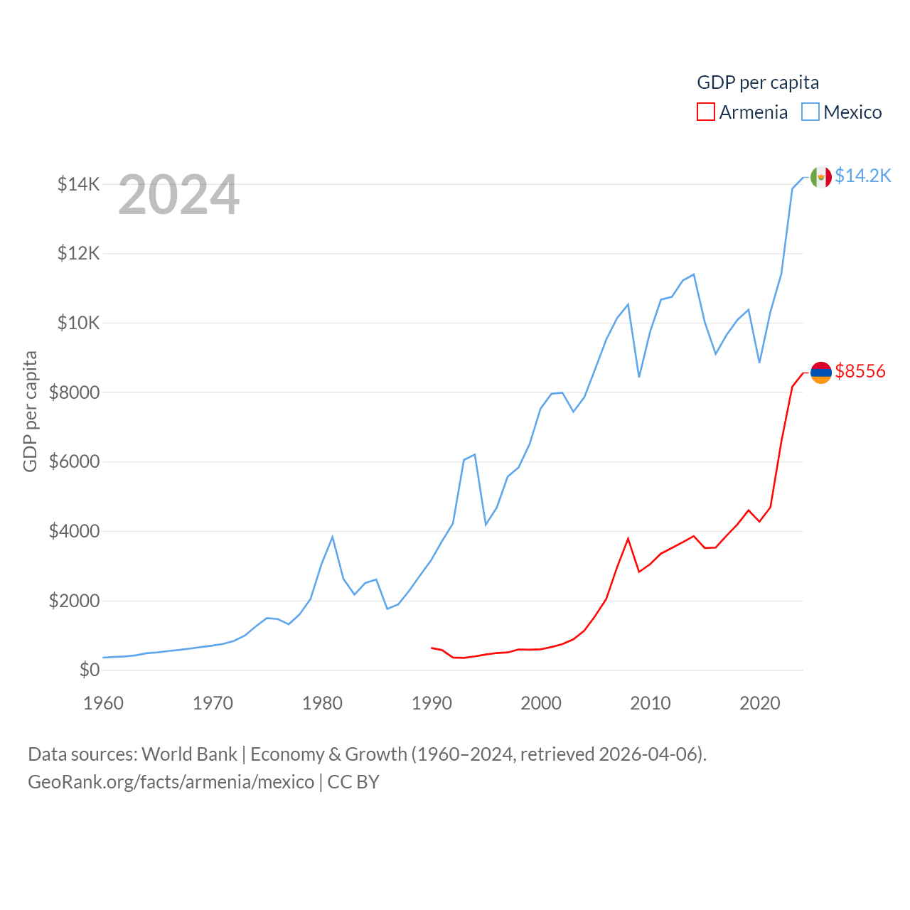 By GDP, Armenia ranks 114/197 ($26B) and Mexico ranks 13/197 ($1.86T). By GDP per capita, Armenia ranks 90/197 ($8,556), while Mexico ranks 69/197 ($14,186).