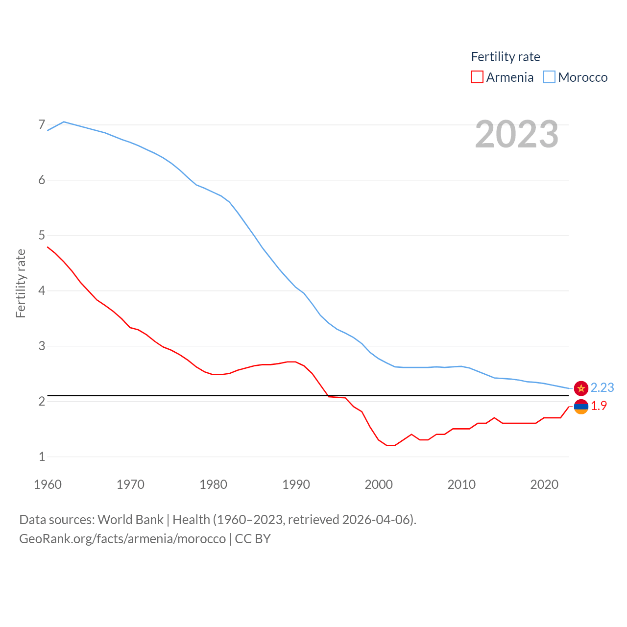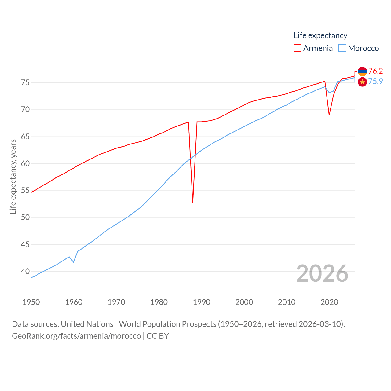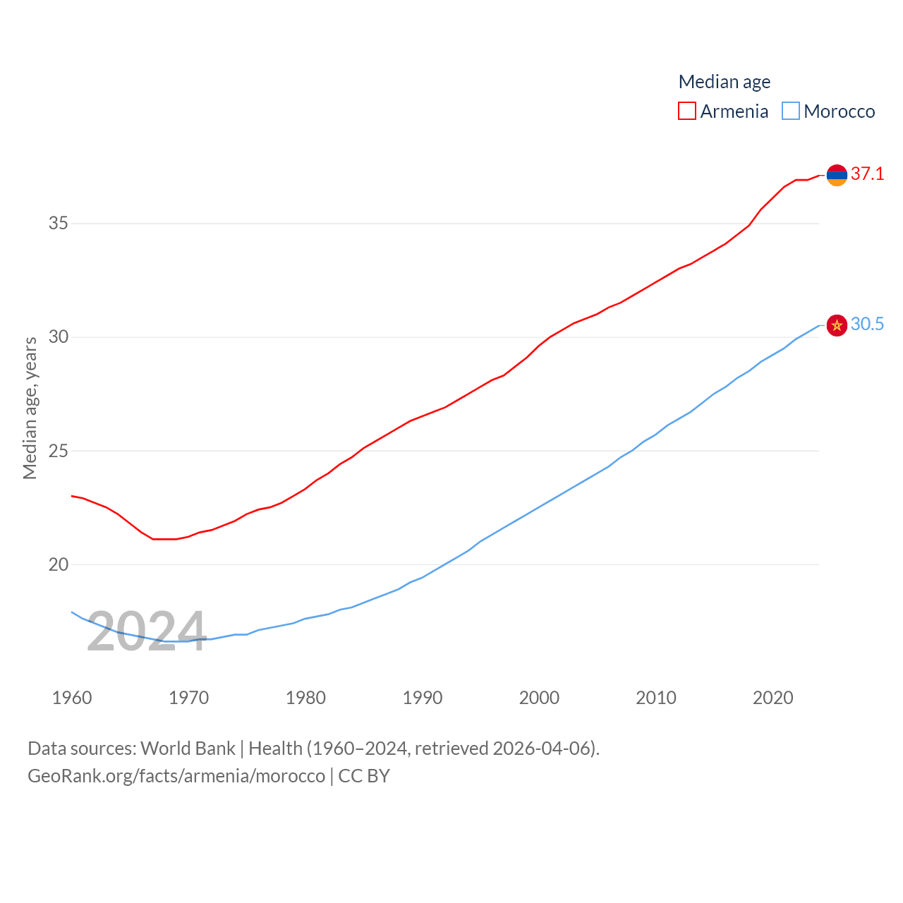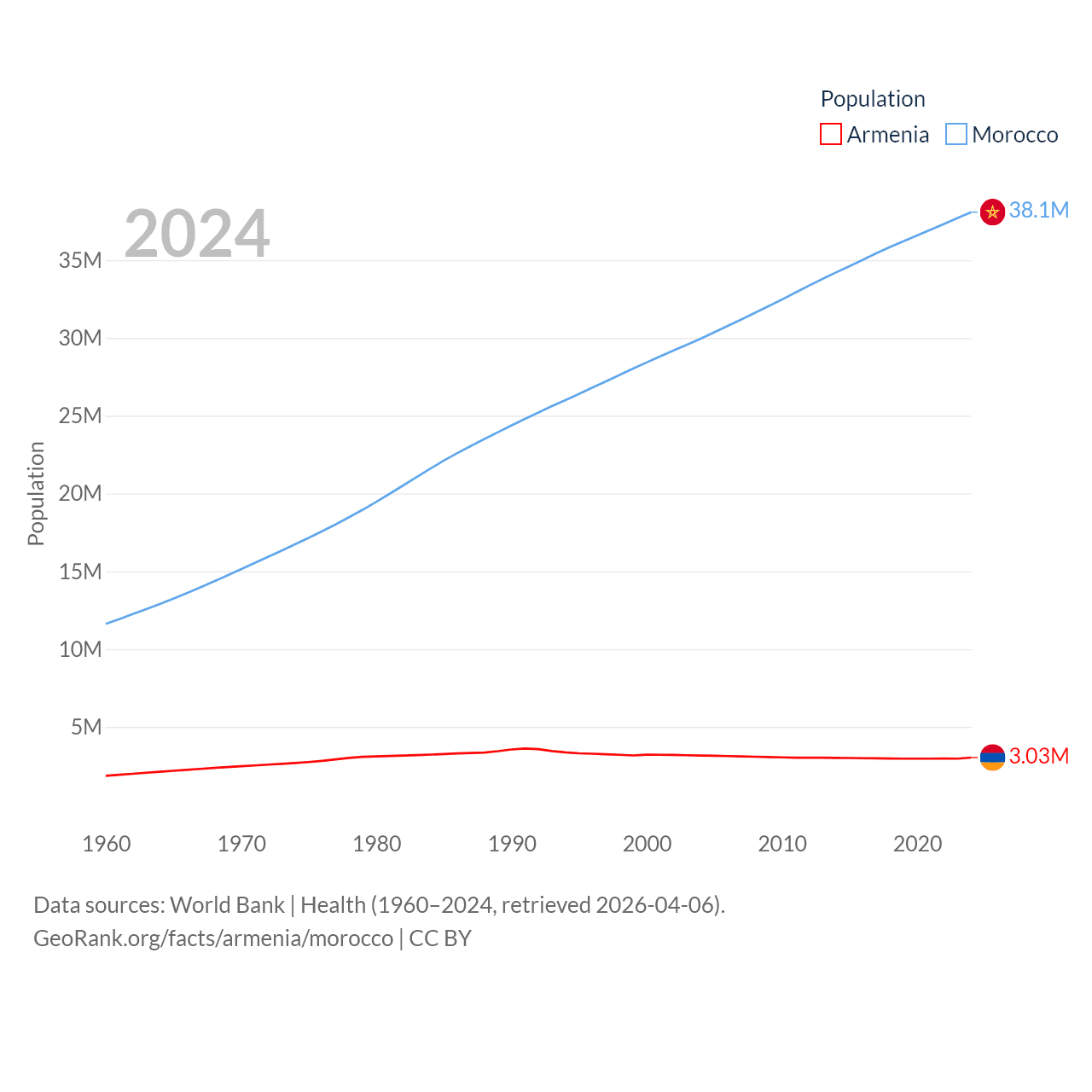 Armenia has a population of 3.03M (ranked 135/197), compared with 38.1M in Morocco (ranked 39/197). Armenia's land area is 10,888 sq mi versus 172,317 sq mi for Morocco (ranked 138th vs. 55th).