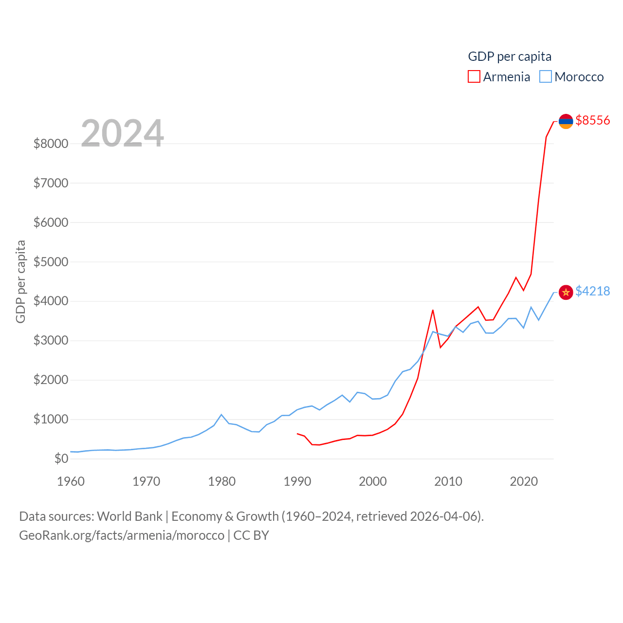 By GDP, Armenia ranks 114/197 ($26B) and Morocco ranks 58/197 ($161B). By GDP per capita, Armenia ranks 90/197 ($8,556), while Morocco ranks 127/197 ($4,218).