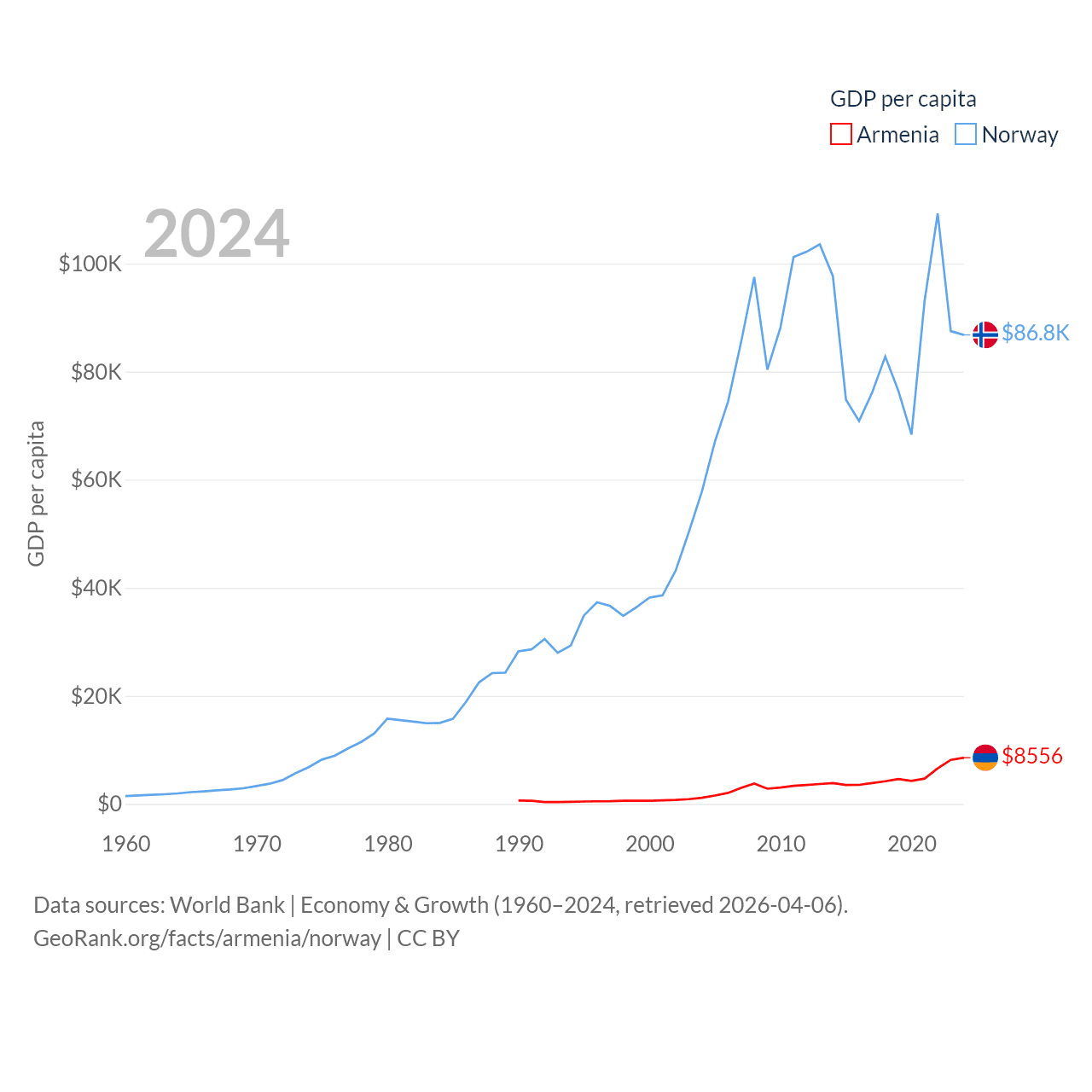 By GDP, Armenia ranks 114/197 ($26B) and Norway ranks 32/197 ($484B). By GDP per capita, Armenia ranks 90/197 ($8,556), while Norway ranks 8/197 ($86,785).