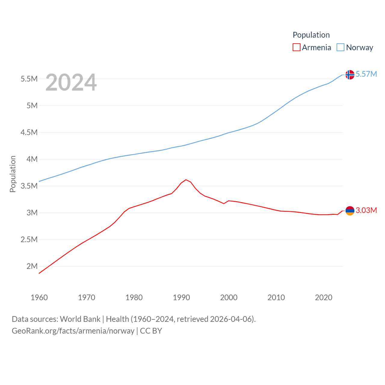 Armenia has a population of 3.03M (ranked 135/197), compared with 5.57M in Norway (ranked 118/197). Armenia's land area is 10,888 sq mi versus 140,645 sq mi for Norway (ranked 138th vs. 62nd).