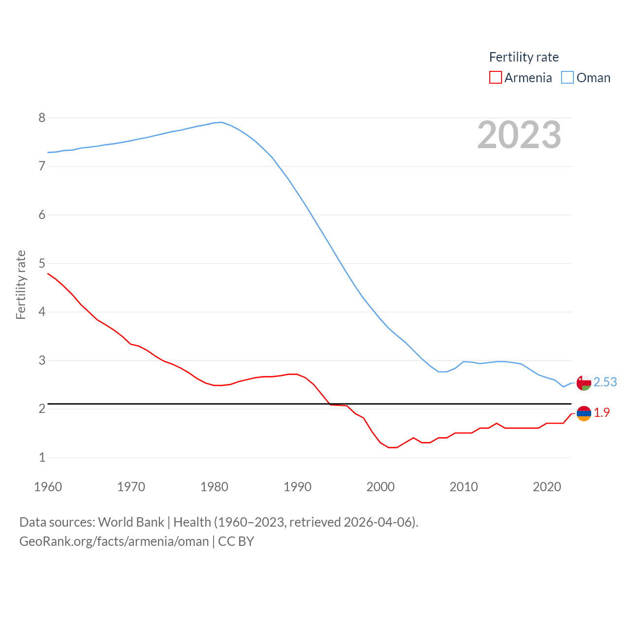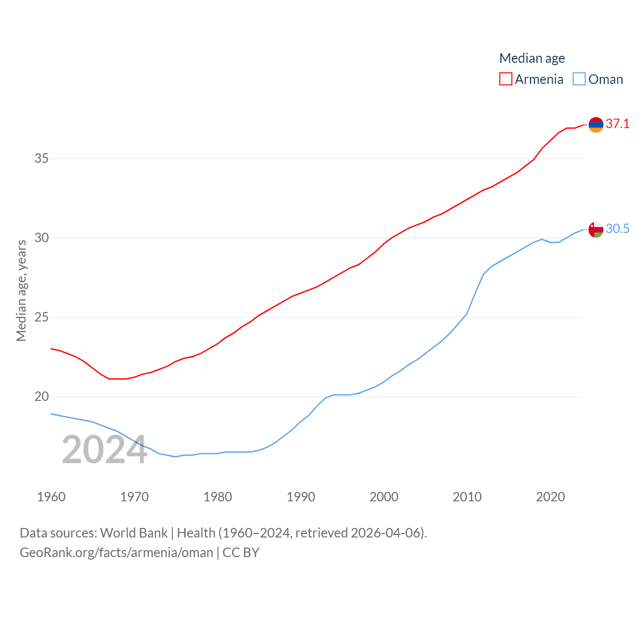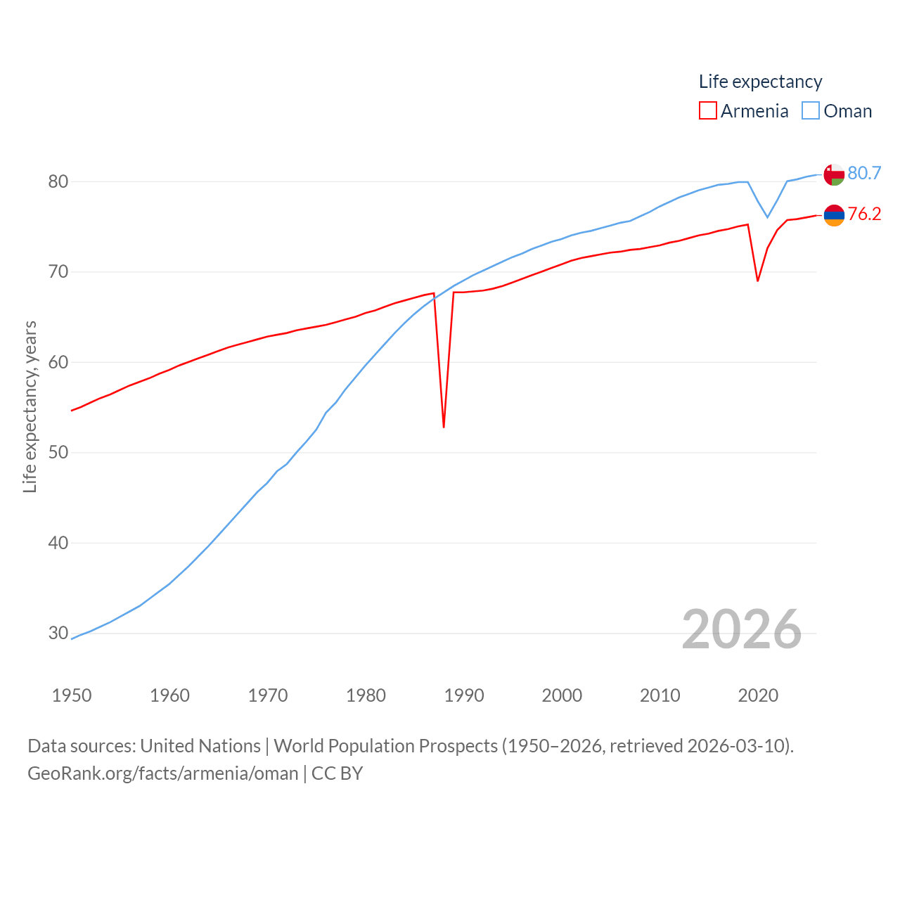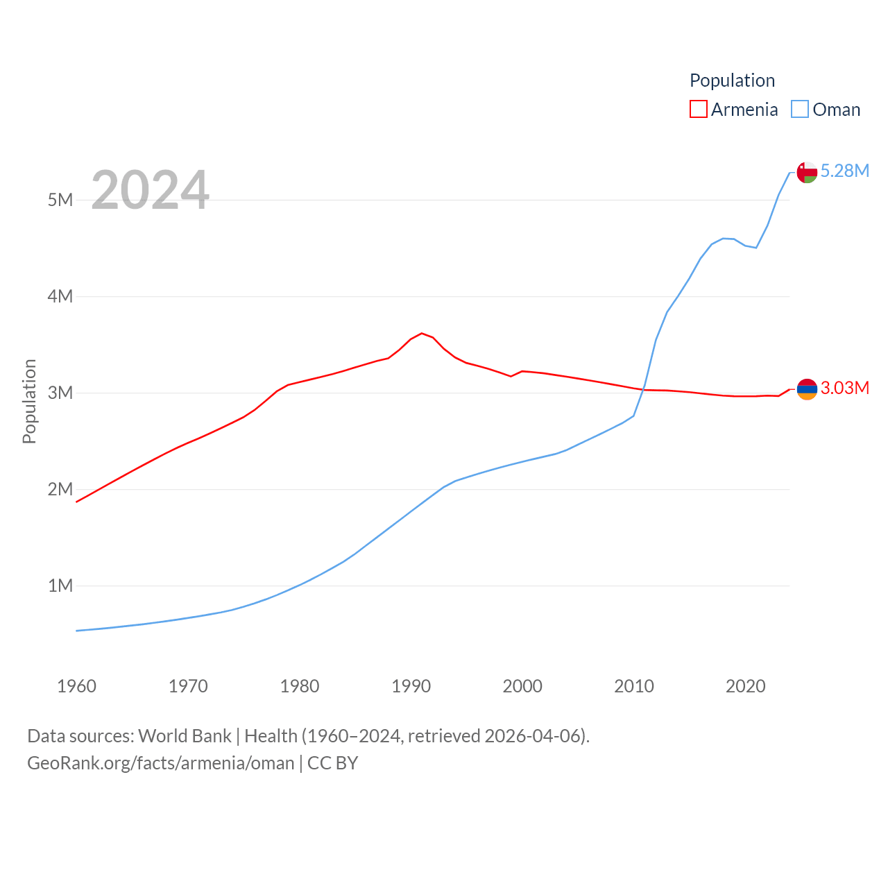 Armenia has a population of 3.03M (ranked 135/197), compared with 5.28M in Oman (ranked 124/197). Armenia's land area is 10,888 sq mi versus 119,499 sq mi for Oman (ranked 138th vs. 68th).