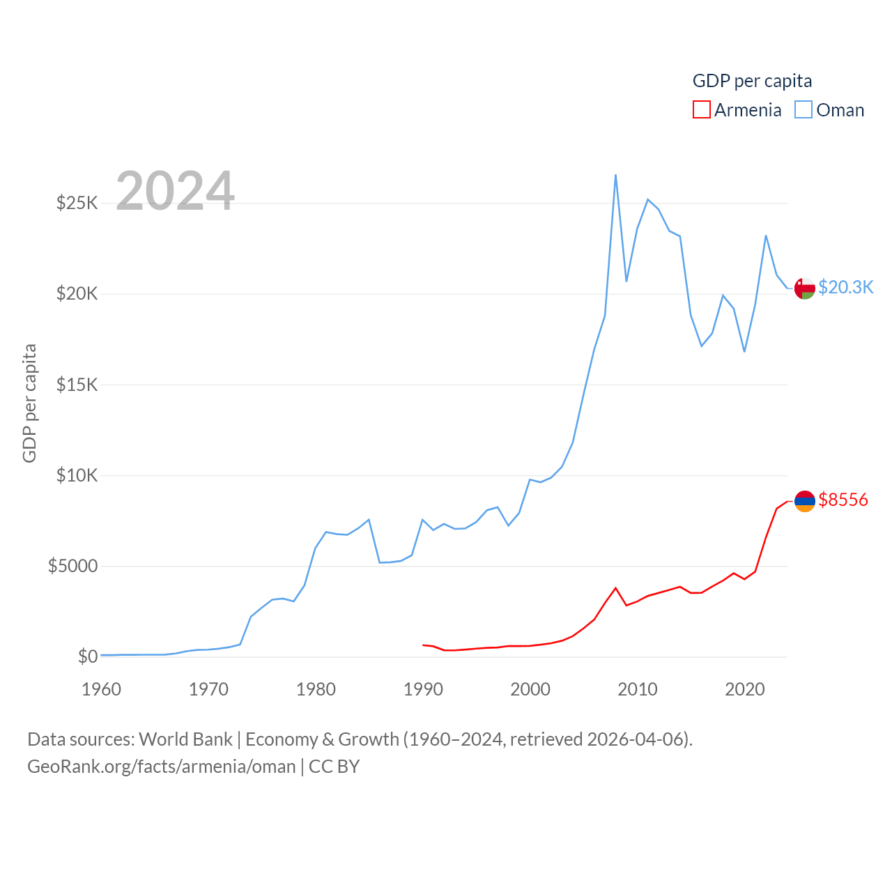 By GDP, Armenia ranks 114/197 ($26B) and Oman ranks 70/197 ($107B). By GDP per capita, Armenia ranks 90/197 ($8,556), while Oman ranks 57/197 ($20,285).
