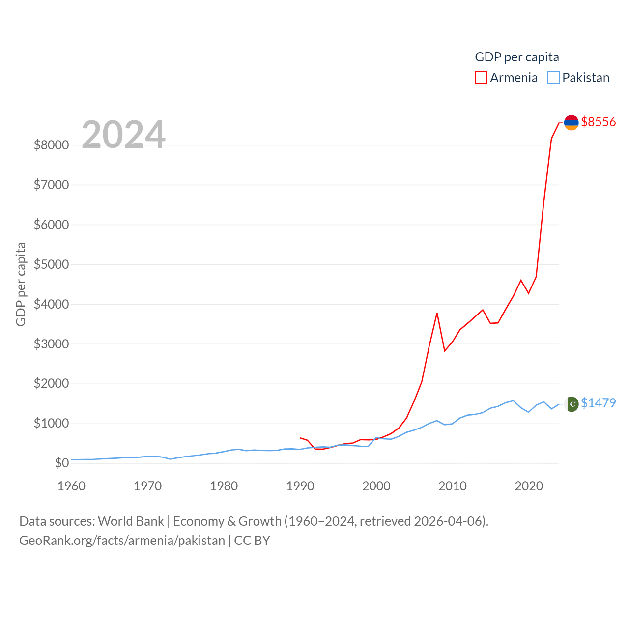 By GDP, Armenia ranks 114/197 ($26B) and Pakistan ranks 43/197 ($372B). By GDP per capita, Armenia ranks 90/197 ($8,556), while Pakistan ranks 163/197 ($1,479).