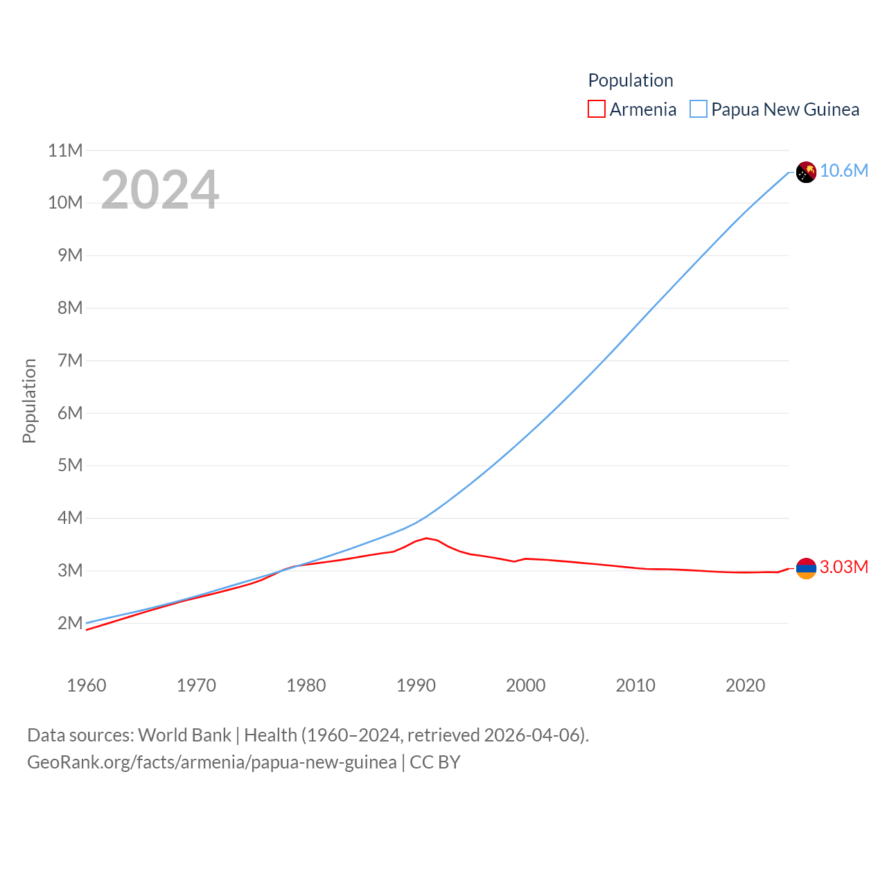 Armenia has a population of 3.03M (ranked 135/197), compared with 10.6M in Papua New Guinea (ranked 92/197). Armenia's land area is 10,888 sq mi versus 174,850 sq mi for Papua New Guinea (ranked 138th vs. 54th).