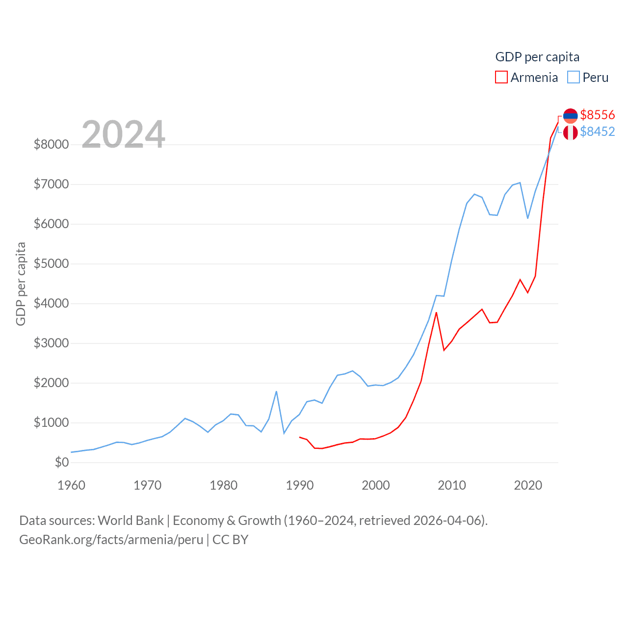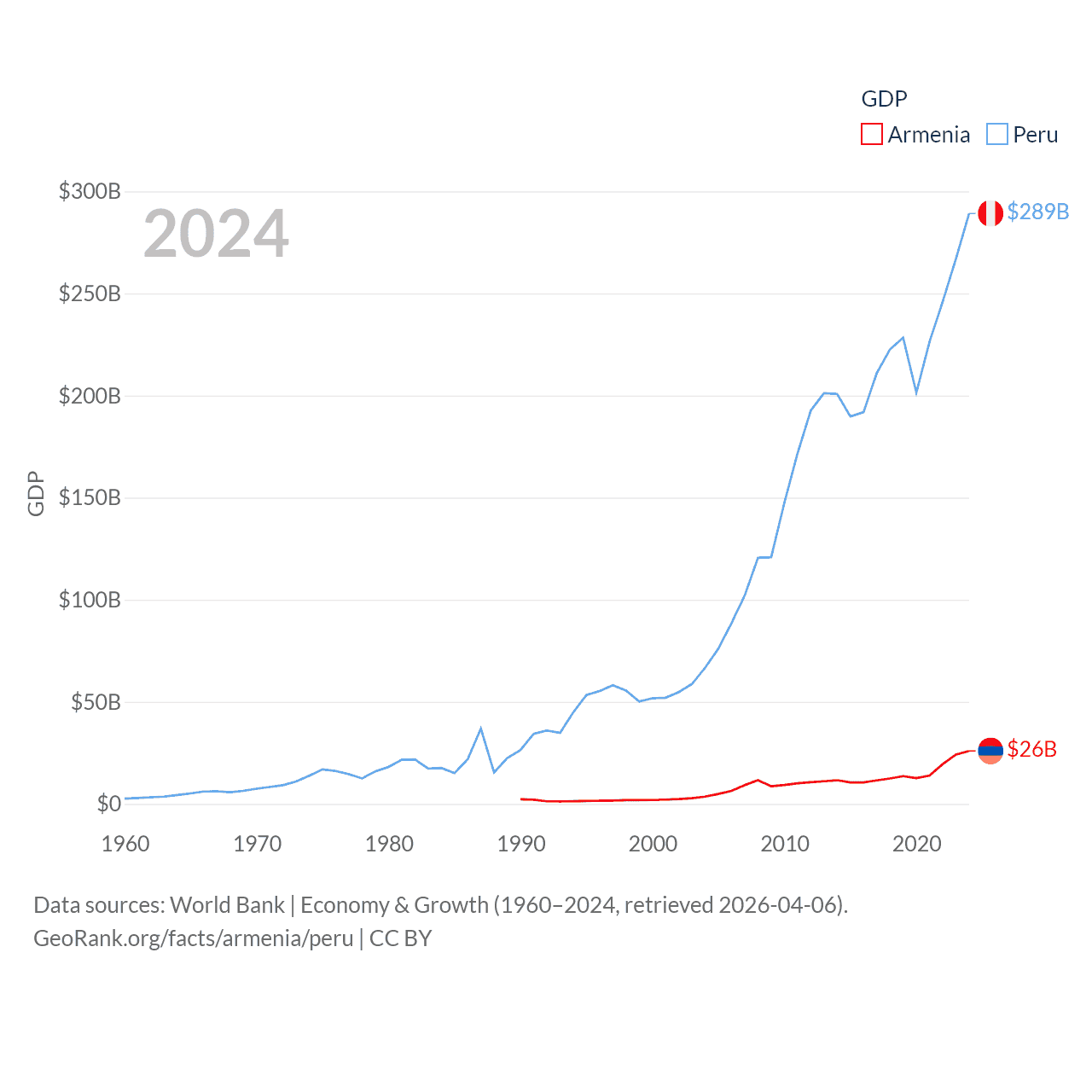 By GDP, Armenia ranks 114/197 ($26B) and Peru ranks 49/197 ($289B). By GDP per capita, Armenia ranks 90/197 ($8,556), while Peru ranks 91/197 ($8,452).
