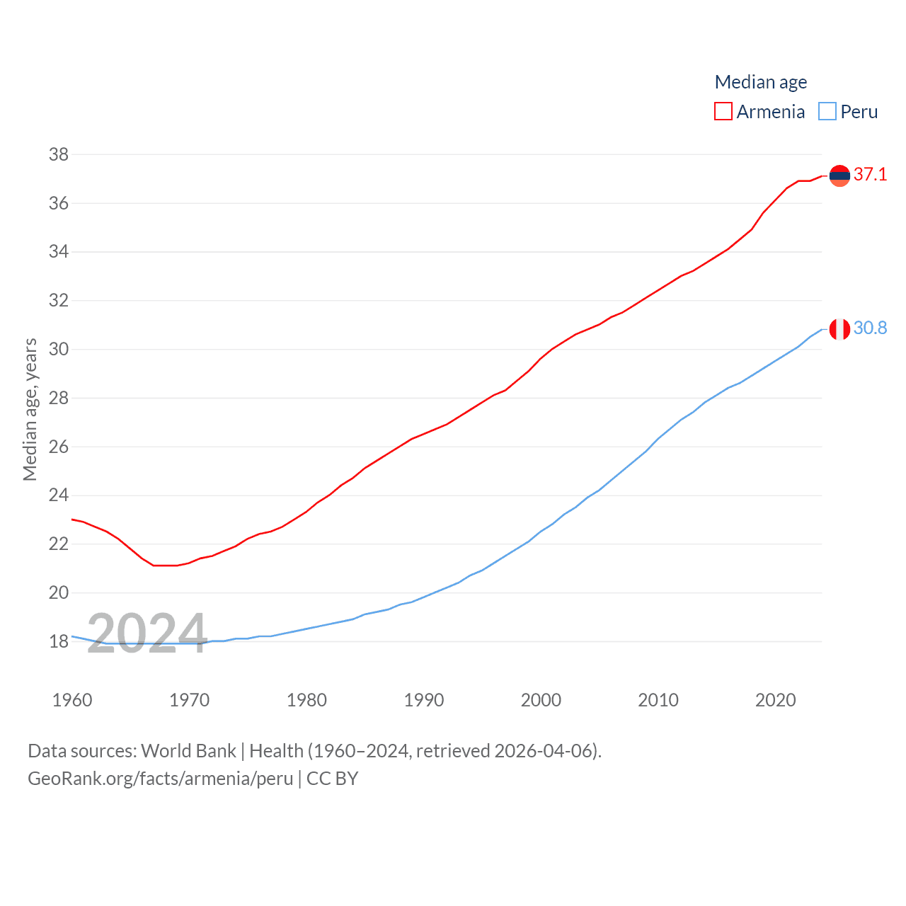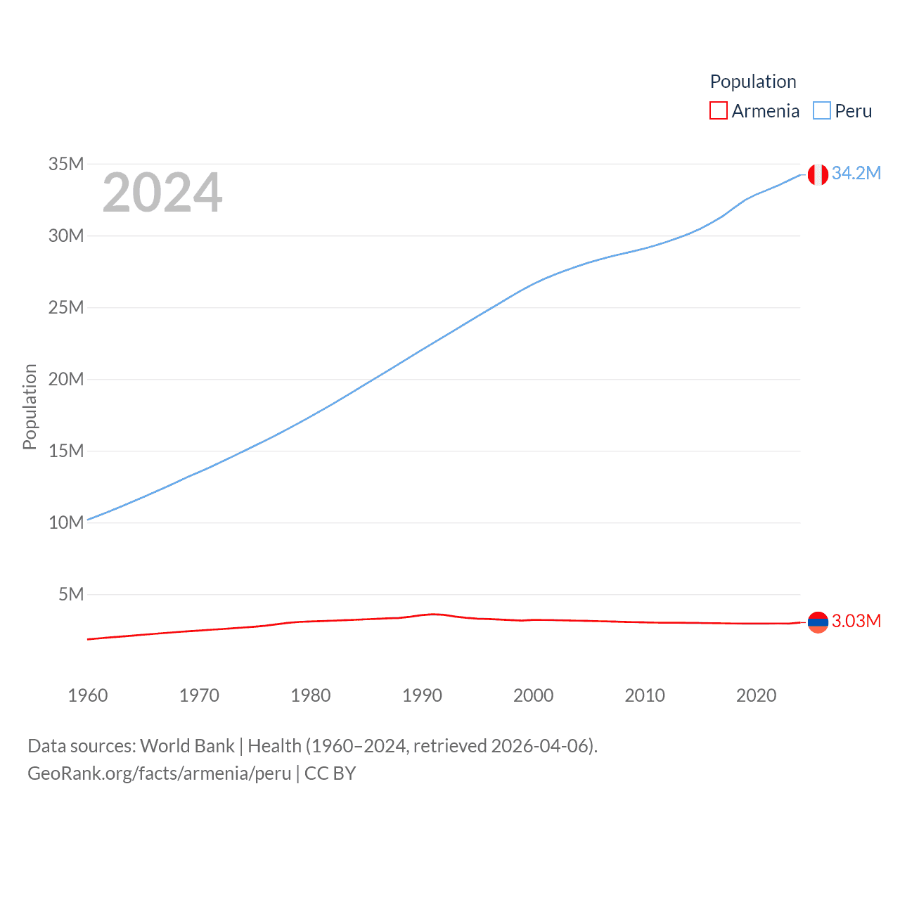 Armenia has a population of 3.03M (ranked 135/197), compared with 34.2M in Peru (ranked 48/197). Armenia's land area is 10,888 sq mi versus 494,211 sq mi for Peru (ranked 138th vs. 19th).