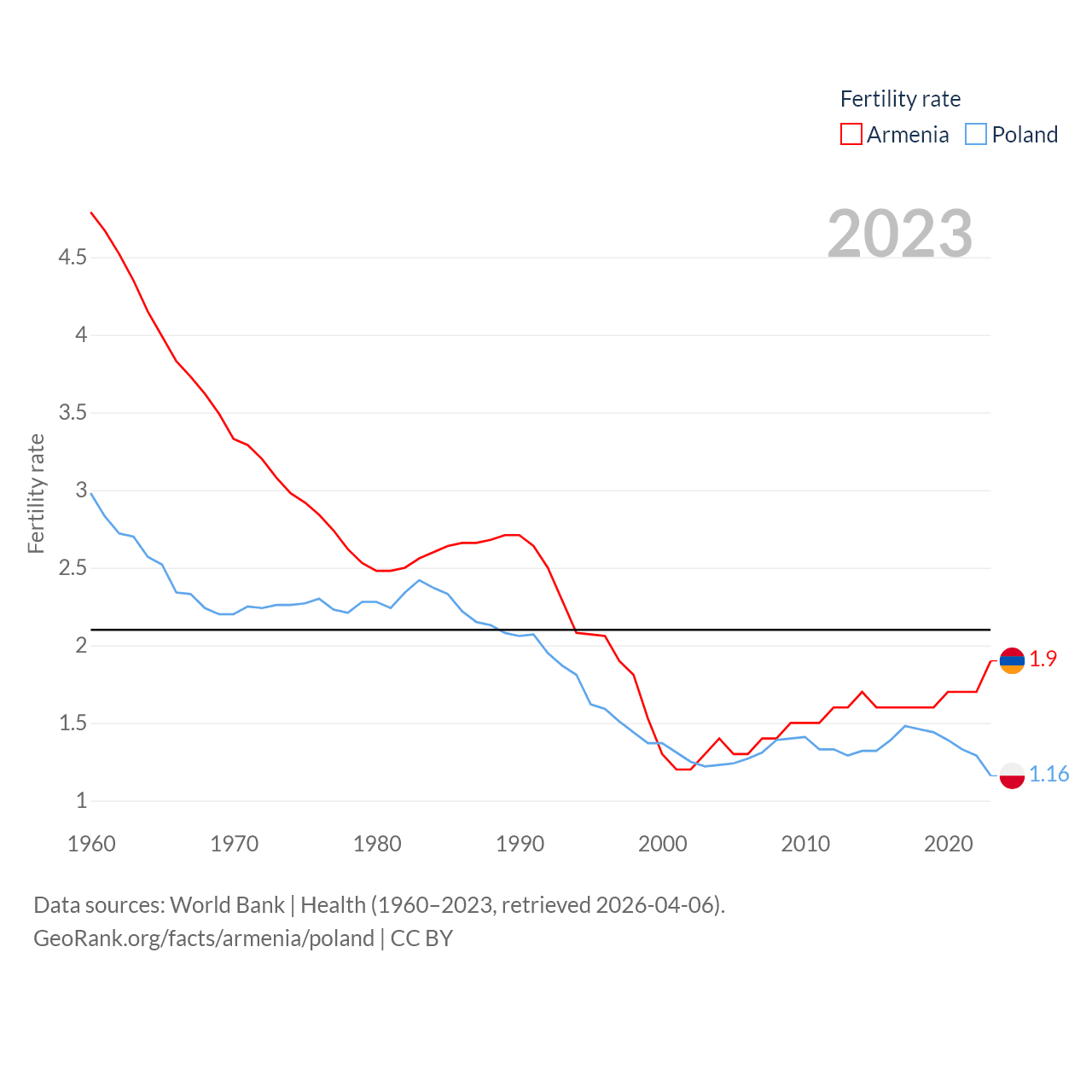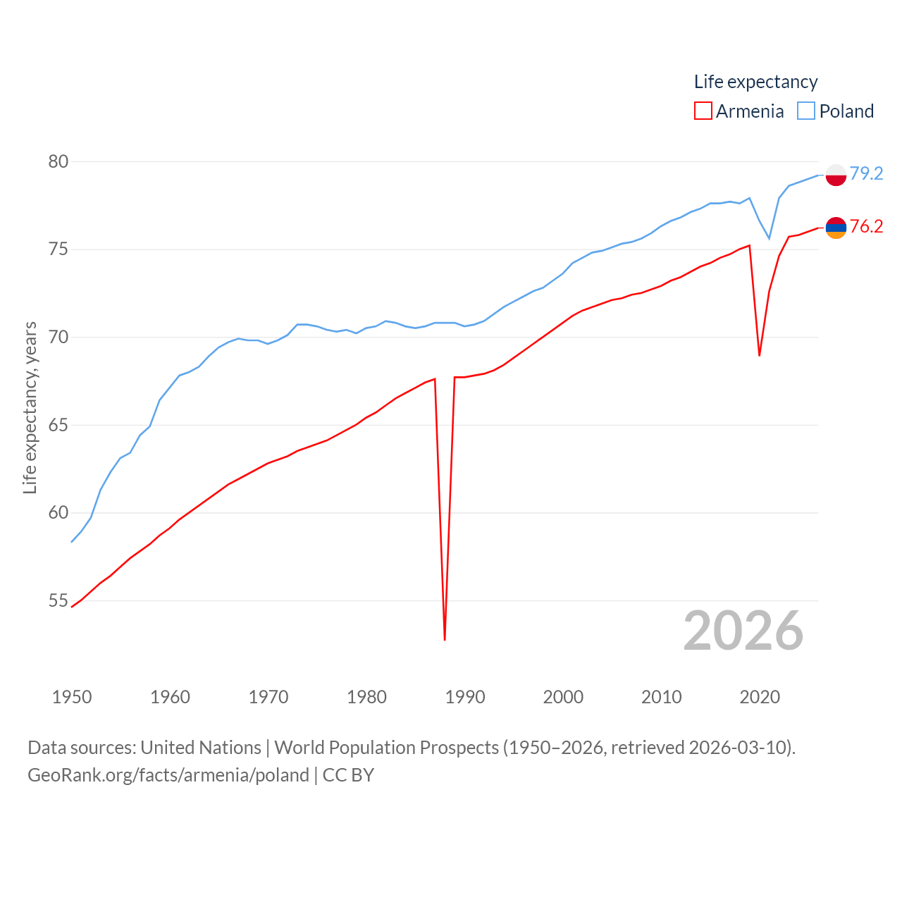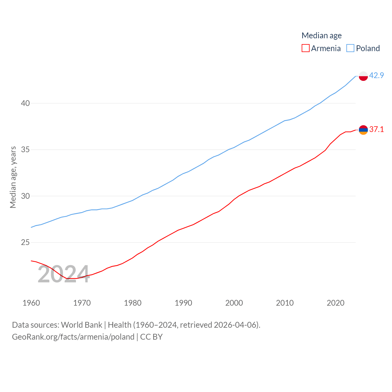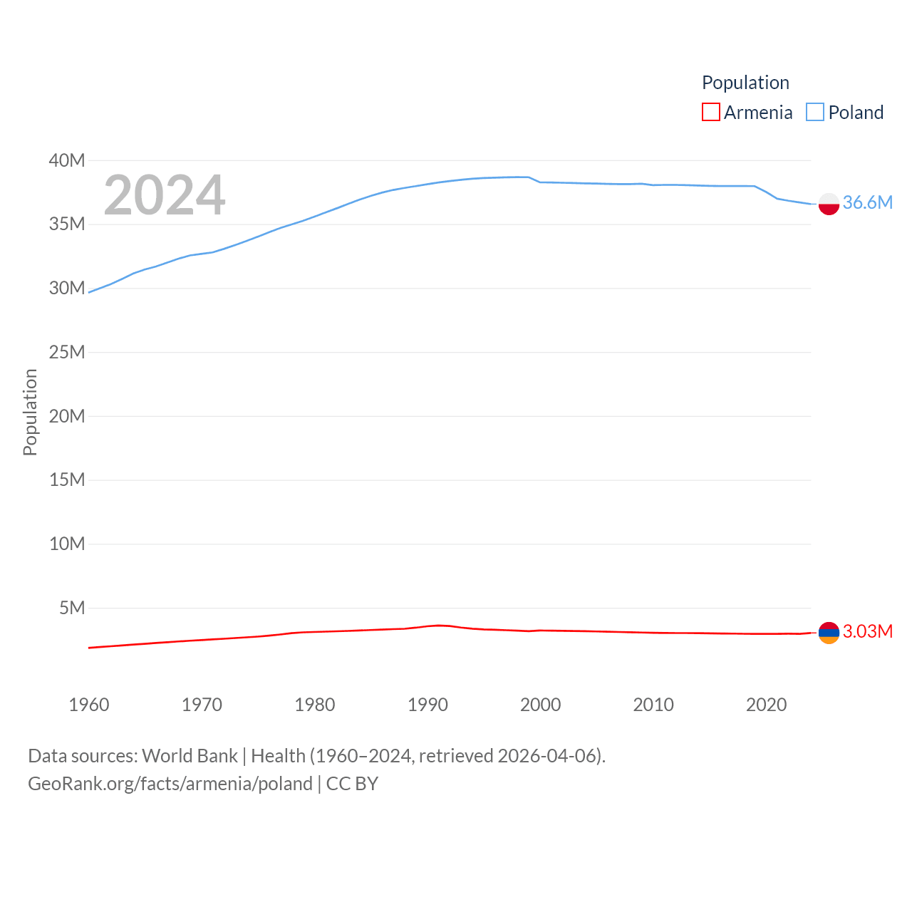 Armenia has a population of 3.03M (ranked 135/197), compared with 36.6M in Poland (ranked 42/197). Armenia's land area is 10,888 sq mi versus 118,252 sq mi for Poland (ranked 138th vs. 69th).