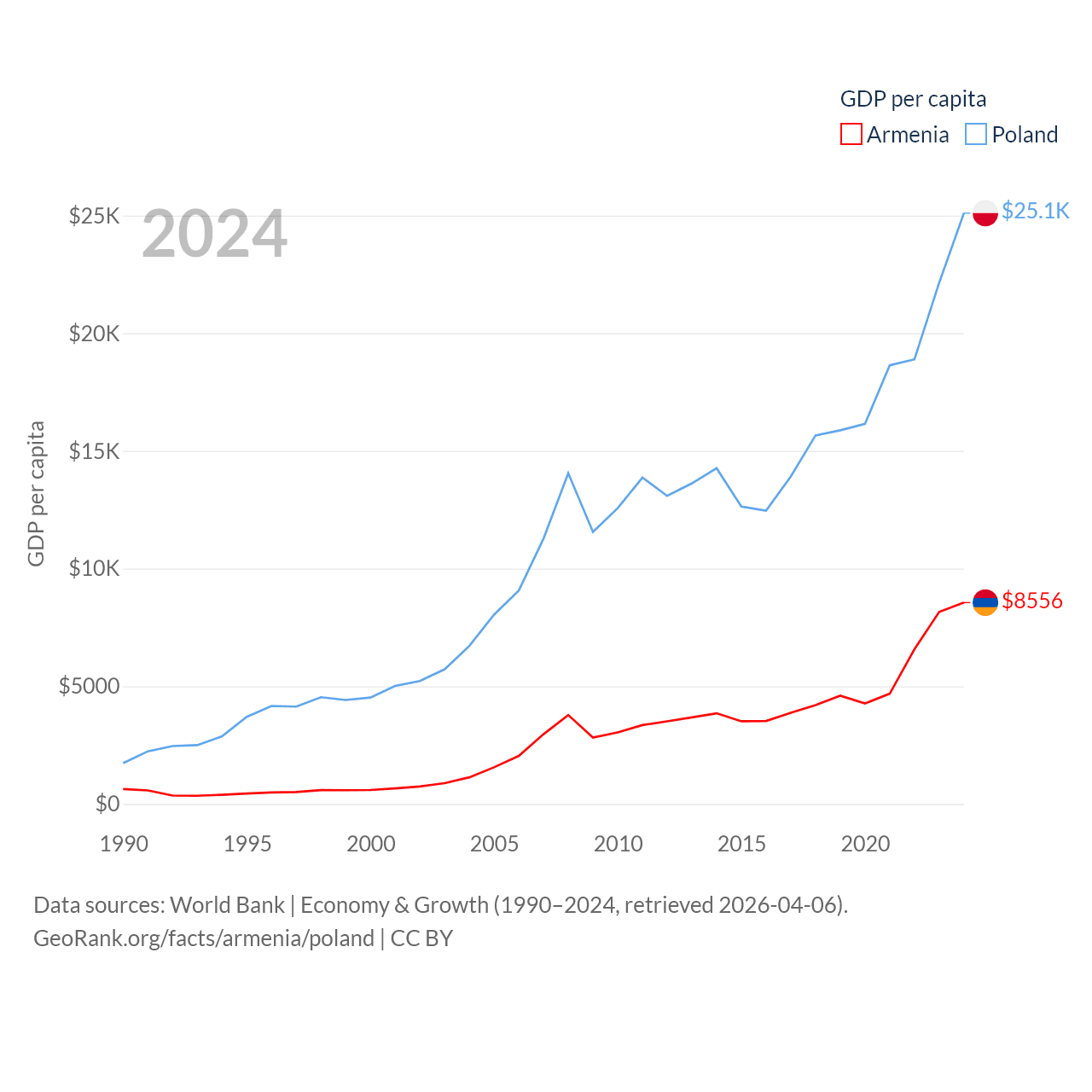 By GDP, Armenia ranks 114/197 ($26B) and Poland ranks 21/197 ($918B). By GDP per capita, Armenia ranks 90/197 ($8,556), while Poland ranks 48/197 ($25,104).
