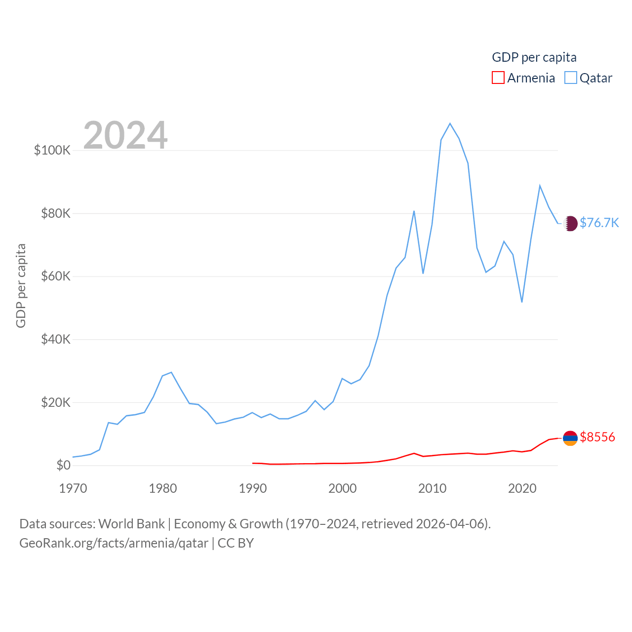 By GDP, Armenia ranks 114/197 ($26B) and Qatar ranks 56/197 ($219B). By GDP per capita, Armenia ranks 90/197 ($8,556), while Qatar ranks 11/197 ($76,689).