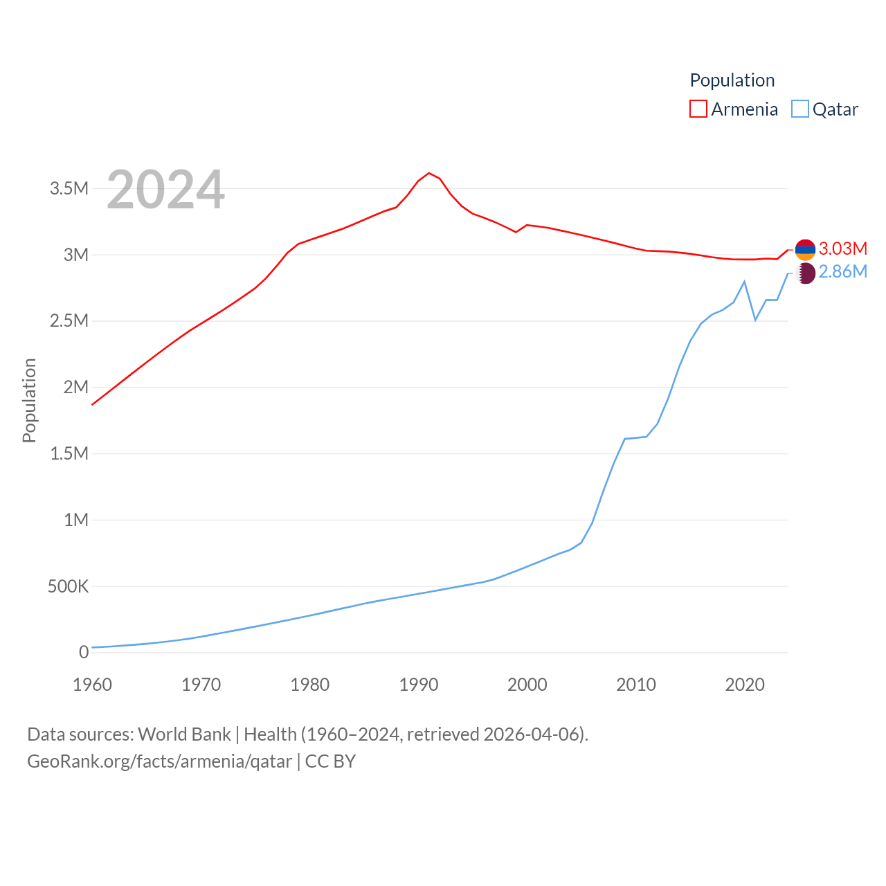 Armenia has a population of 3.03M (ranked 135/197), compared with 2.86M in Qatar (ranked 138/197). Armenia's land area is 10,888 sq mi versus 4,436 sq mi for Qatar (ranked 138th vs. 158th).