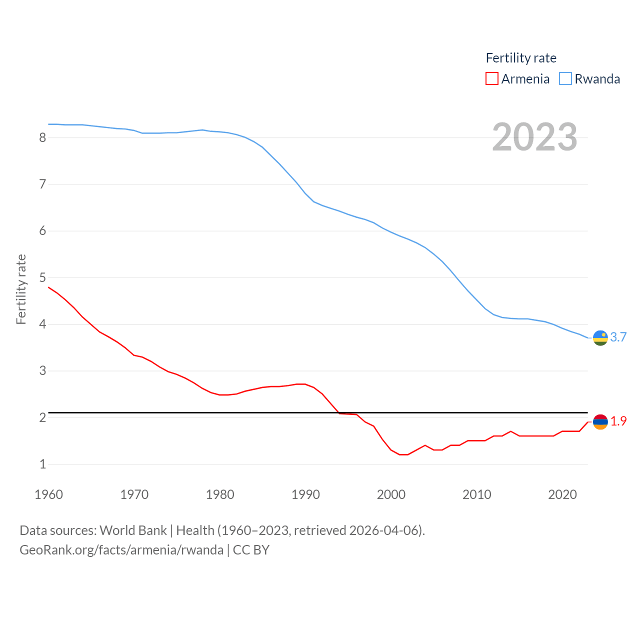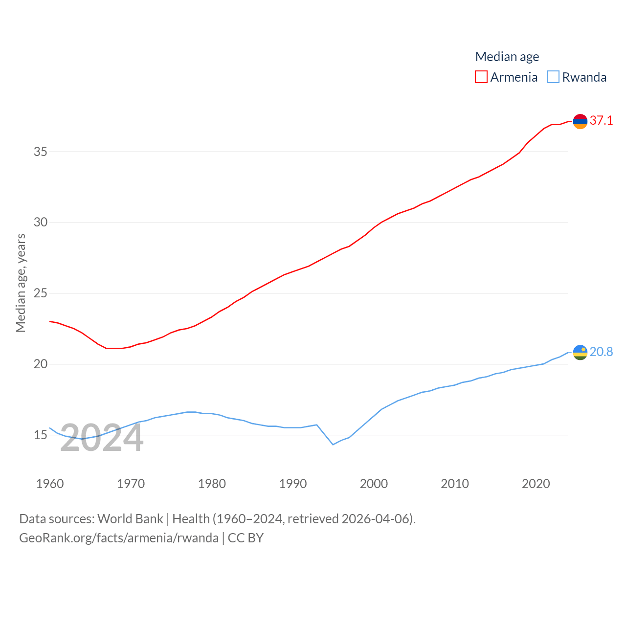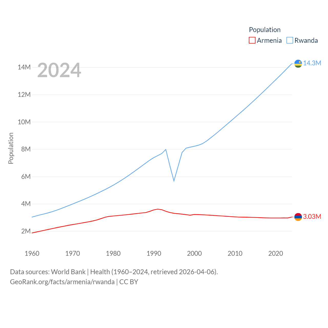 Armenia has a population of 3.03M (ranked 135/197), compared with 14.3M in Rwanda (ranked 77/197). Armenia's land area is 10,888 sq mi versus 9,525 sq mi for Rwanda (ranked 138th vs. 146th).