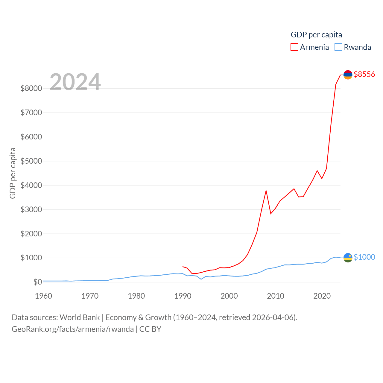 By GDP, Armenia ranks 114/197 ($26B) and Rwanda ranks 144/197 ($14.3B). By GDP per capita, Armenia ranks 90/197 ($8,556), while Rwanda ranks 178/197 ($1,000).