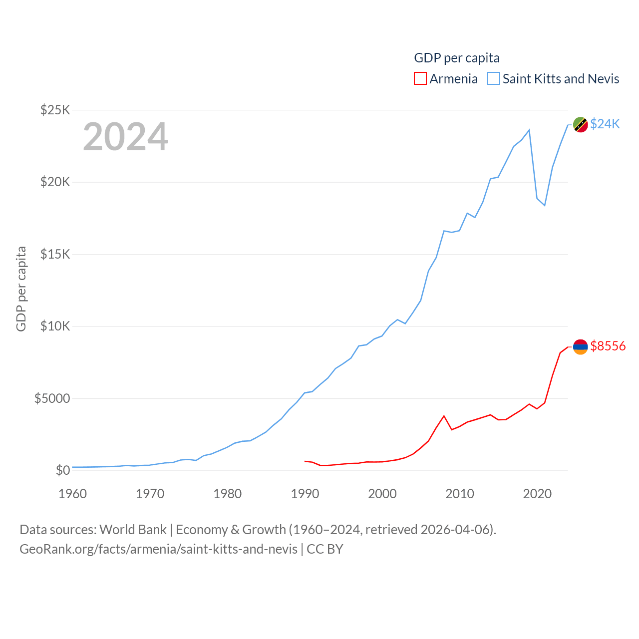 By GDP, Armenia ranks 114/197 ($26B) and Saint Kitts and Nevis ranks 187/197 ($1.12B). By GDP per capita, Armenia ranks 90/197 ($8,556), while Saint Kitts and Nevis ranks 51/197 ($23,961).