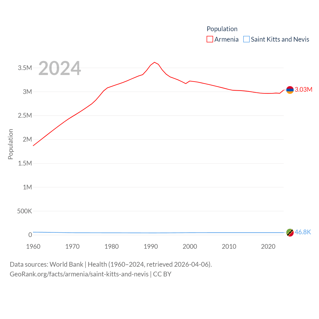 Armenia has a population of 3.03M (ranked 135/197), compared with 46.8K in Saint Kitts and Nevis (ranked 189/197). Armenia's land area is 10,888 sq mi versus 100.4 sq mi for Saint Kitts and Nevis (ranked 138th vs. 189th).