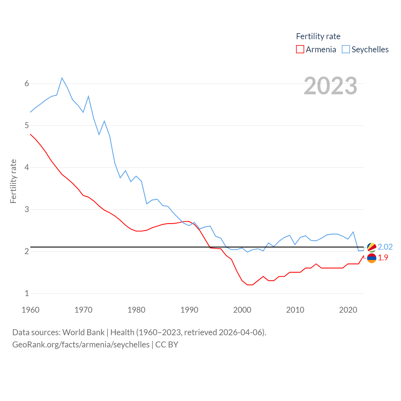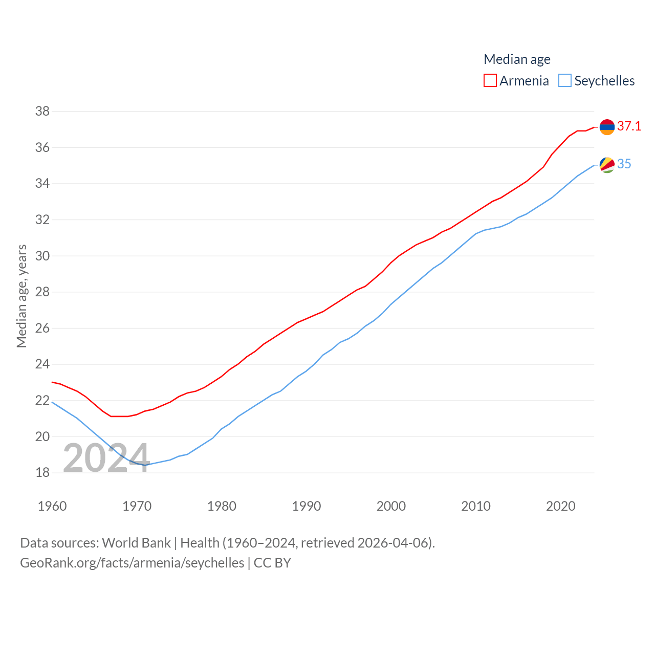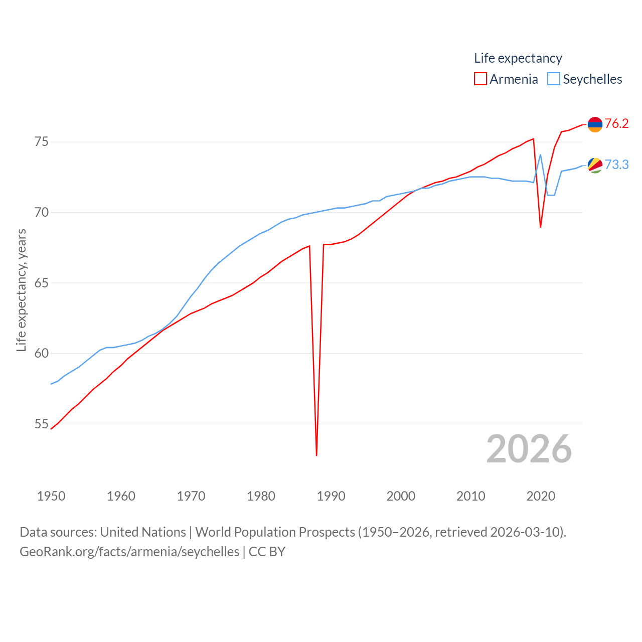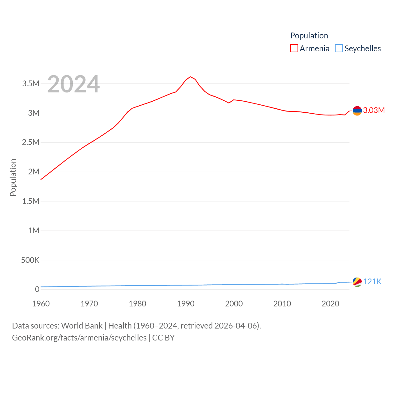 Armenia has a population of 3.03M (ranked 135/197), compared with 121K in The Seychelles (ranked 181/197). Armenia's land area is 10,888 sq mi versus 177.6 sq mi for The Seychelles (ranked 138th vs. 181st).