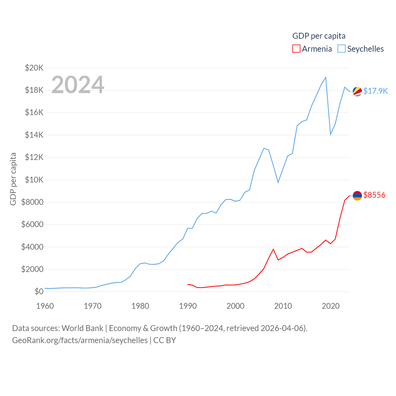 By GDP, Armenia ranks 114/197 ($26B) and The Seychelles ranks 178/197 ($2.17B). By GDP per capita, Armenia ranks 90/197 ($8,556), while The Seychelles ranks 63/197 ($17,859).