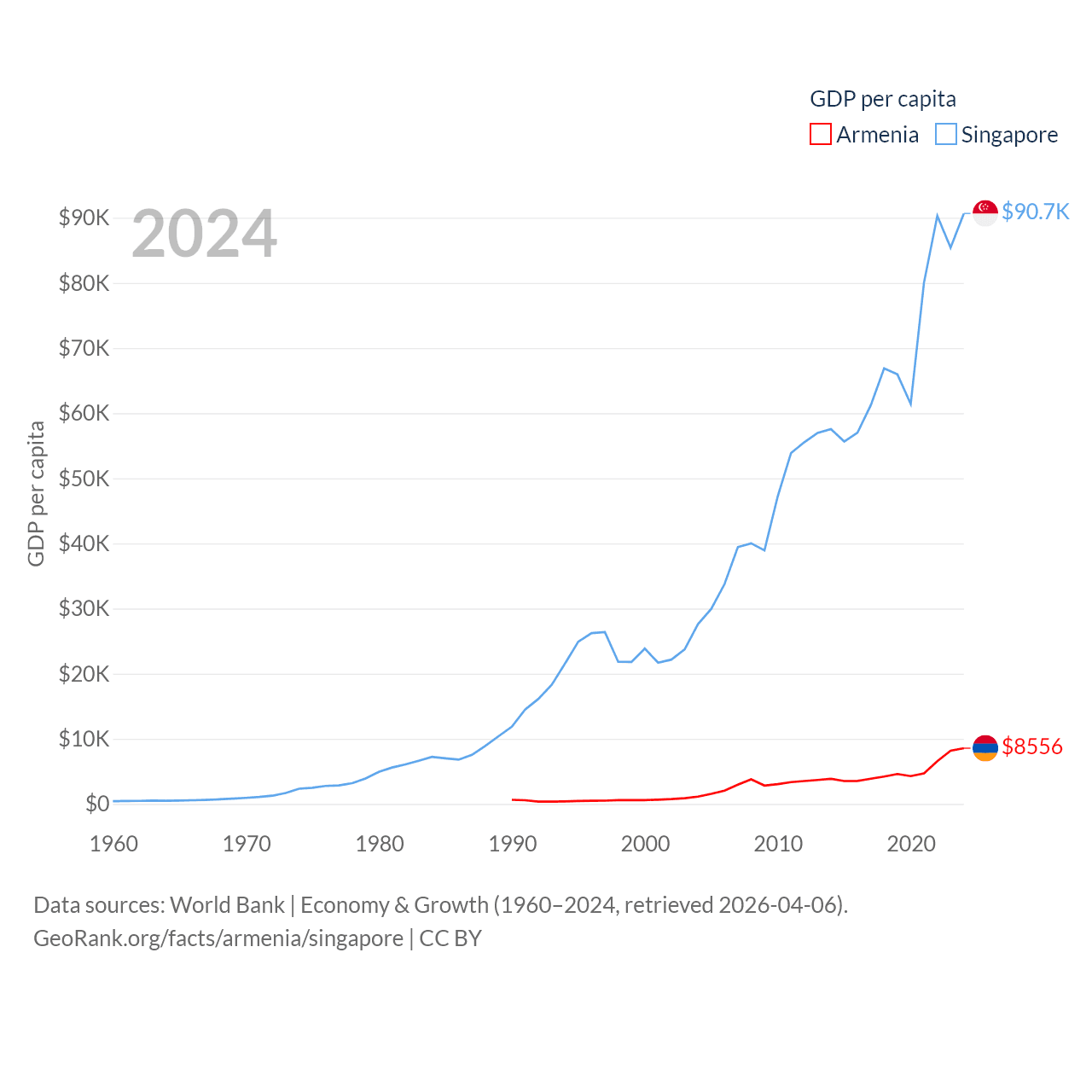By GDP, Armenia ranks 114/197 ($26B) and Singapore ranks 28/197 ($547B). By GDP per capita, Armenia ranks 90/197 ($8,556), while Singapore ranks 7/197 ($90,674).