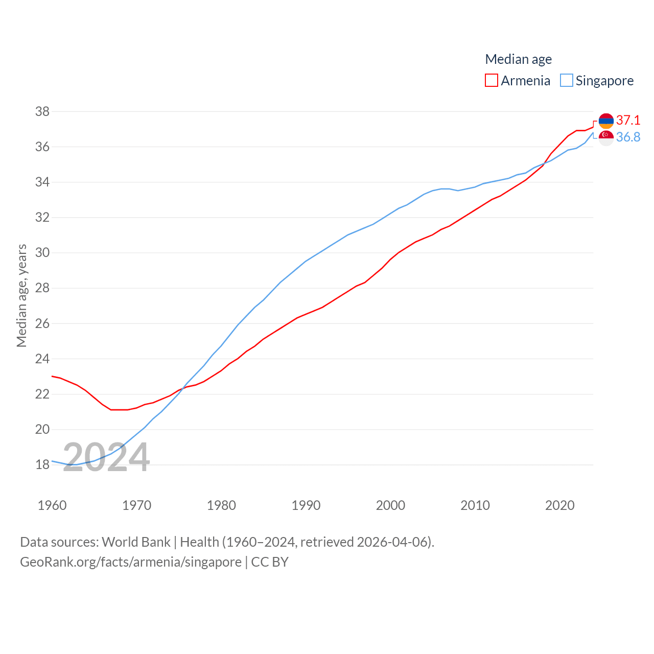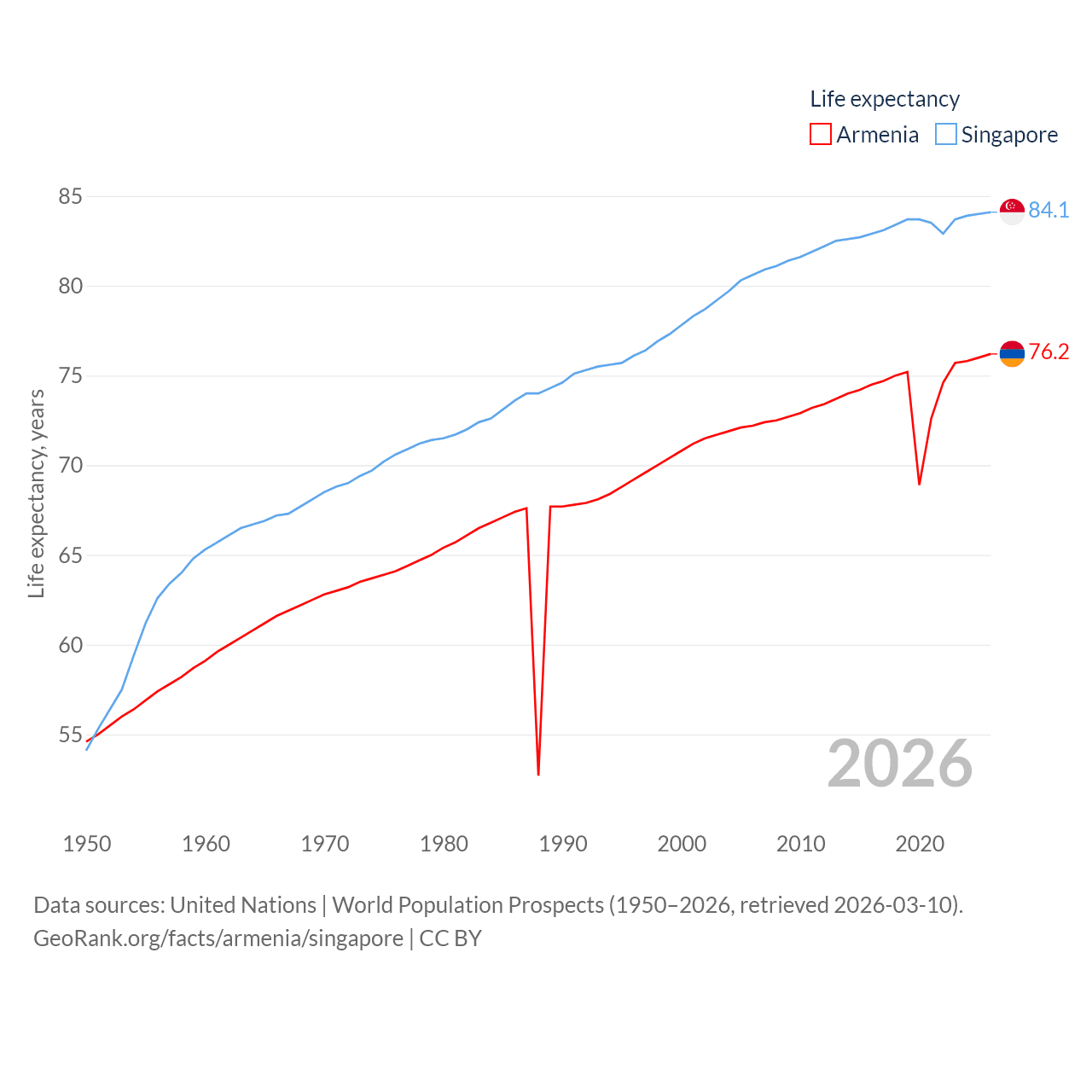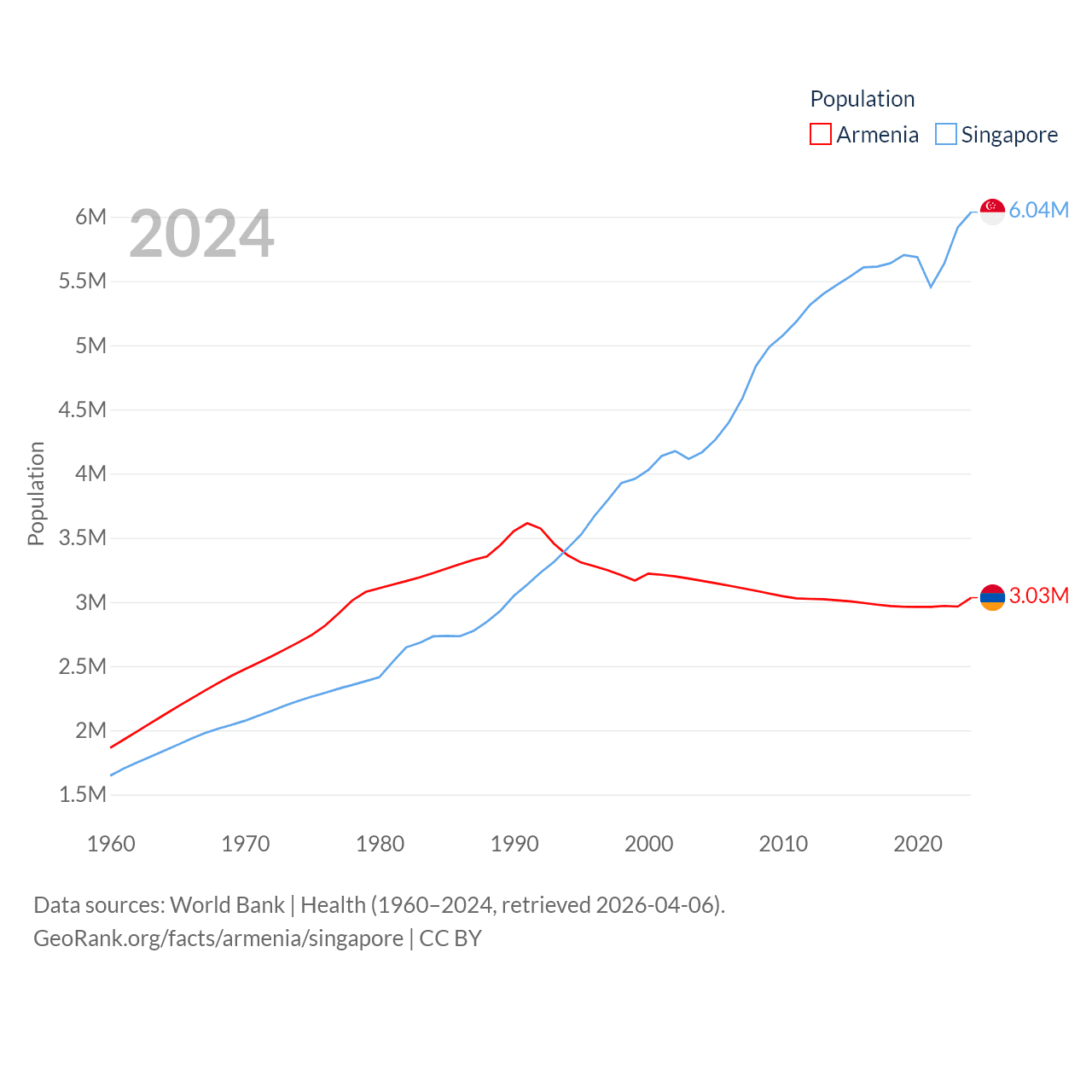 Armenia has a population of 3.03M (ranked 135/197), compared with 6.04M in Singapore (ranked 113/197). Armenia's land area is 10,888 sq mi versus 277.2 sq mi for Singapore (ranked 138th vs. 177th).