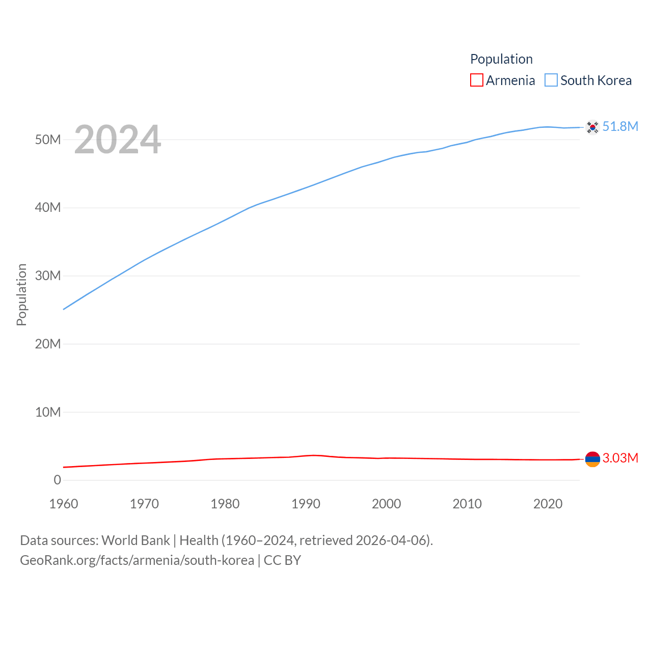 Armenia has a population of 3.03M (ranked 135/197), compared with 51.8M in South Korea (ranked 29/197). Armenia's land area is 10,888 sq mi versus 37,684 sq mi for South Korea (ranked 138th vs. 105th).