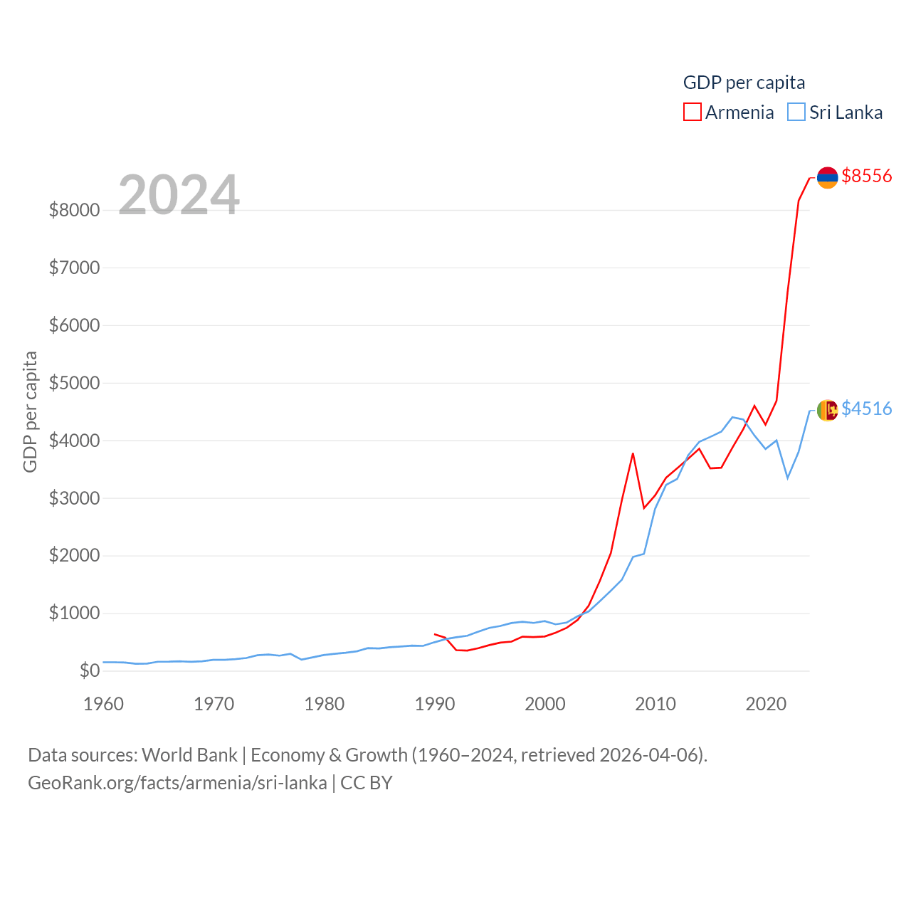 By GDP, Armenia ranks 114/197 ($26B) and Sri Lanka ranks 72/197 ($99B). By GDP per capita, Armenia ranks 90/197 ($8,556), while Sri Lanka ranks 124/197 ($4,516).