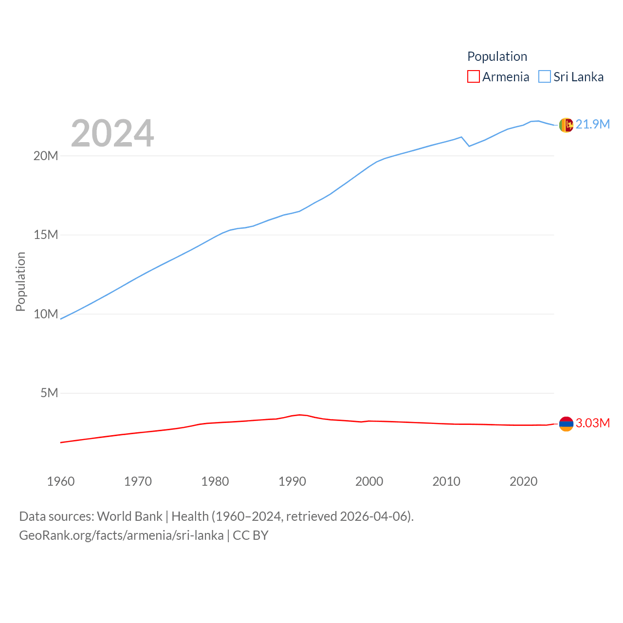 Armenia has a population of 3.03M (ranked 135/197), compared with 21.9M in Sri Lanka (ranked 61/197). Armenia's land area is 10,888 sq mi versus 23,884 sq mi for Sri Lanka (ranked 138th vs. 122nd).