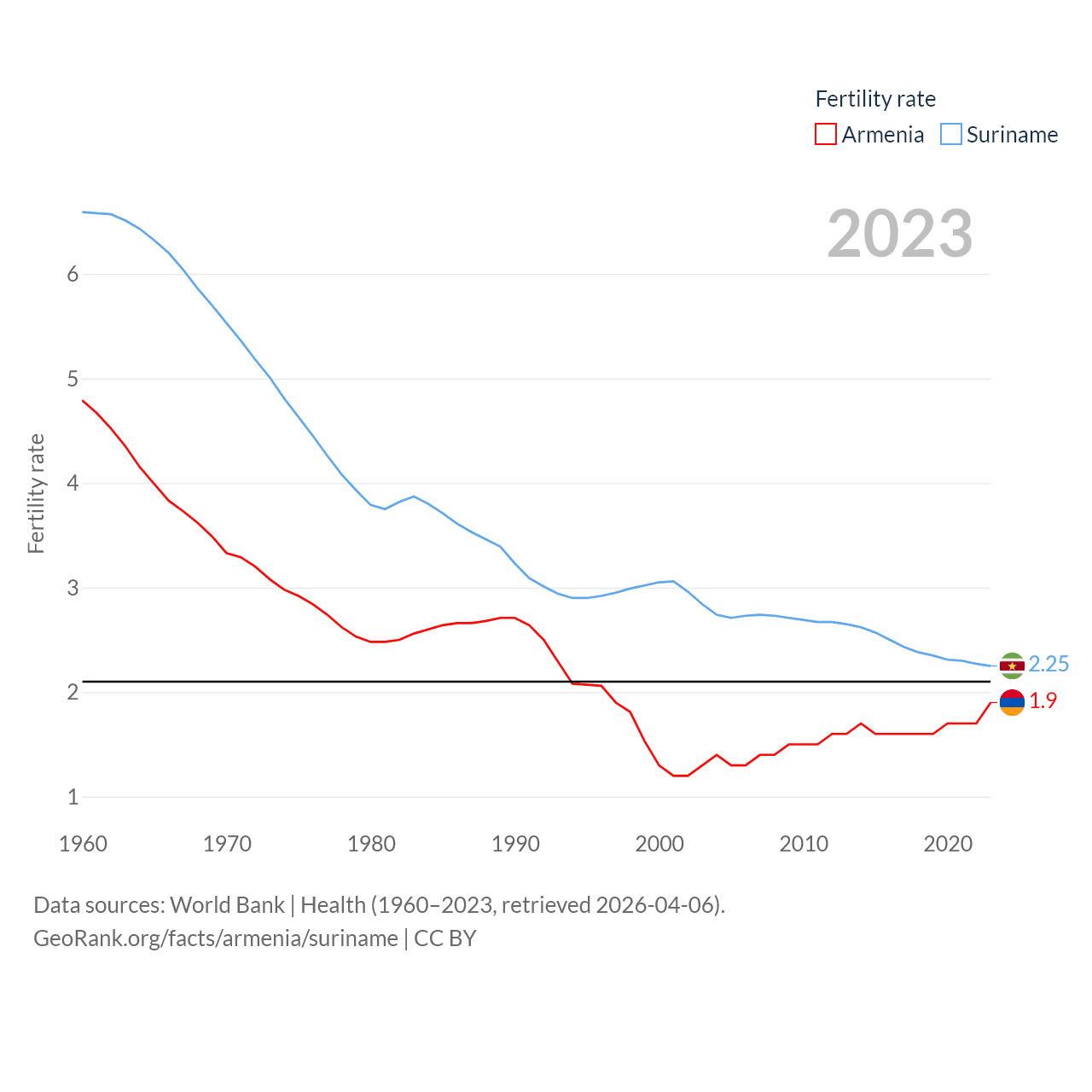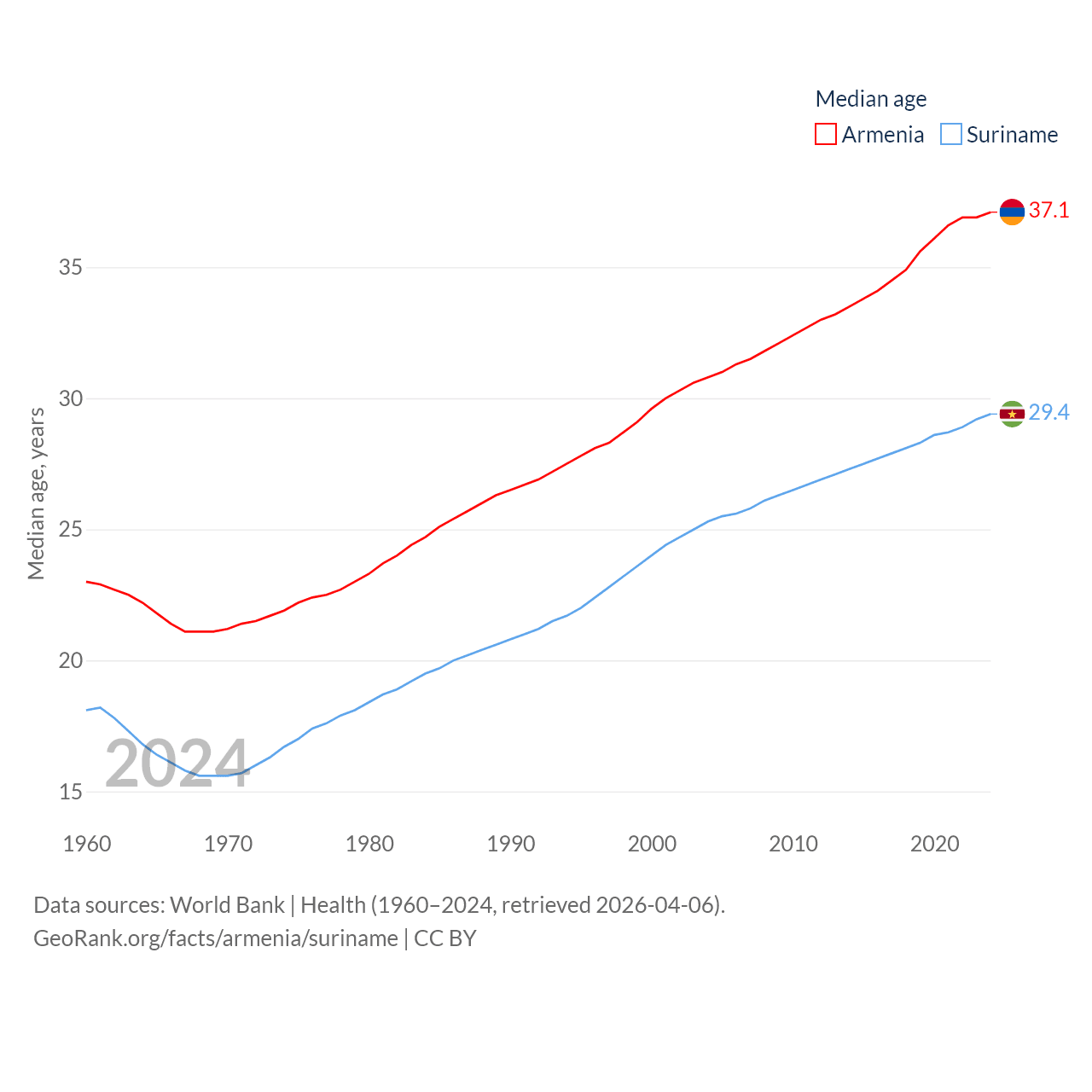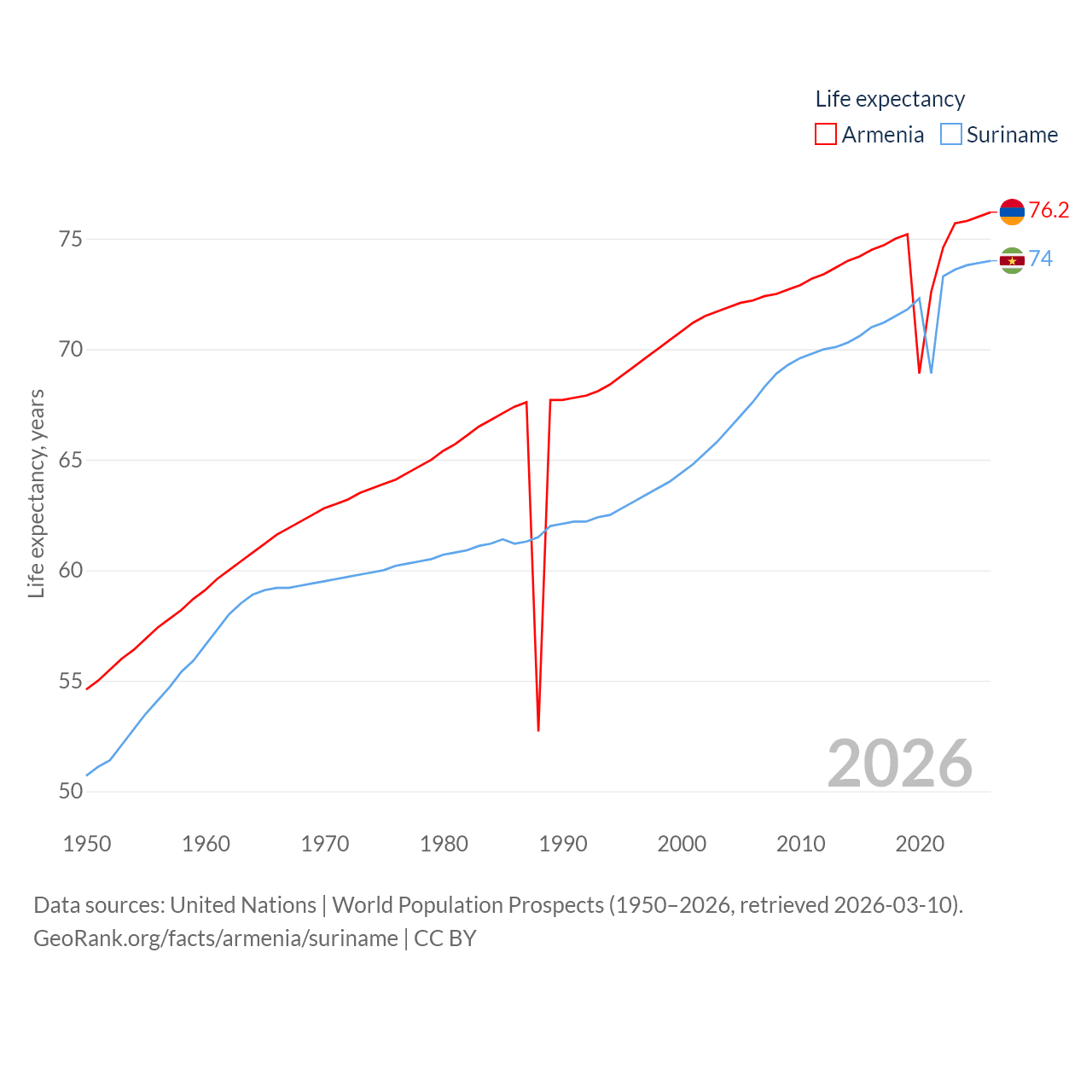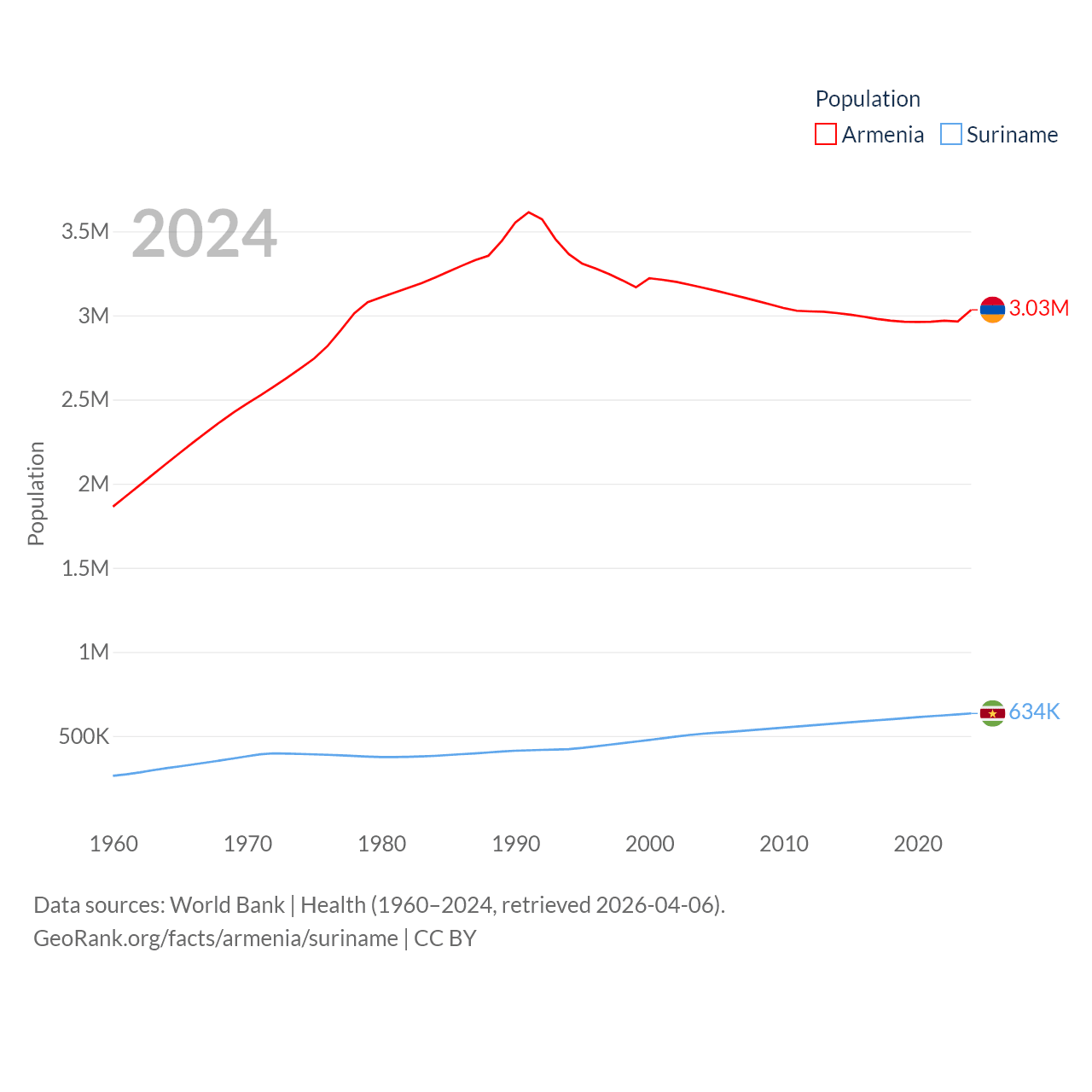 Armenia has a population of 3.03M (ranked 135/197), compared with 634K in Suriname (ranked 165/197). Armenia's land area is 10,888 sq mi versus 61,972 sq mi for Suriname (ranked 138th vs. 90th).