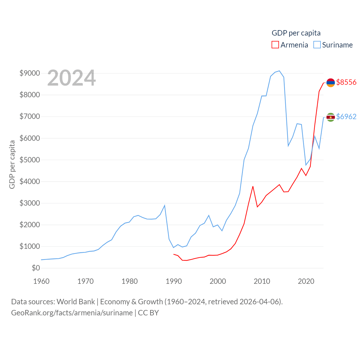 By GDP, Armenia ranks 114/197 ($26B) and Suriname ranks 164/197 ($4.42B). By GDP per capita, Armenia ranks 90/197 ($8,556), while Suriname ranks 102/197 ($6,962).