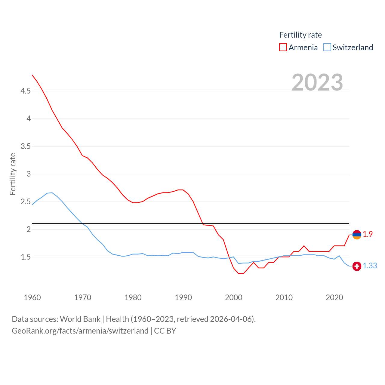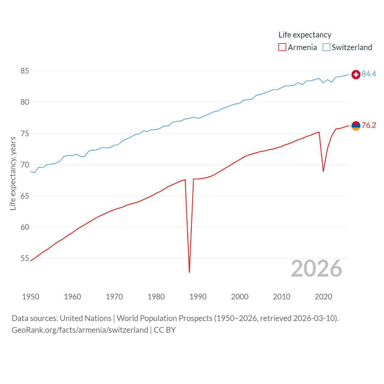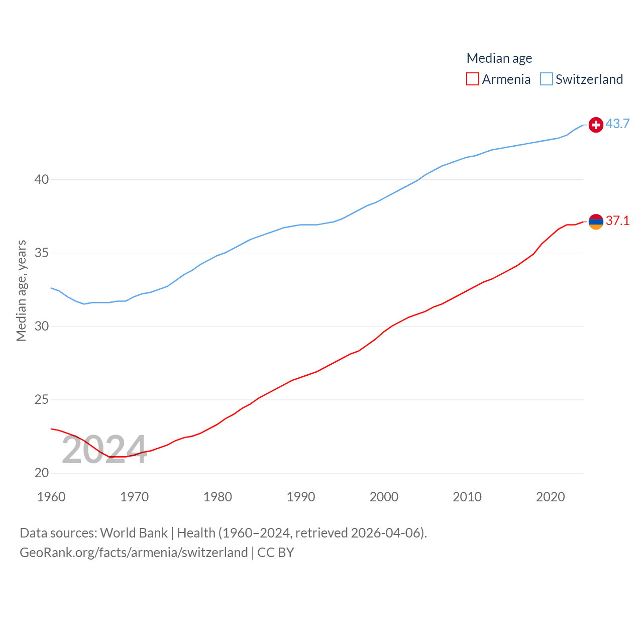 Armenia has a population of 3.03M (ranked 135/197), compared with 9.01M in Switzerland (ranked 101/197). Armenia's land area is 10,888 sq mi versus 15,255 sq mi for Switzerland (ranked 138th vs. 131st).