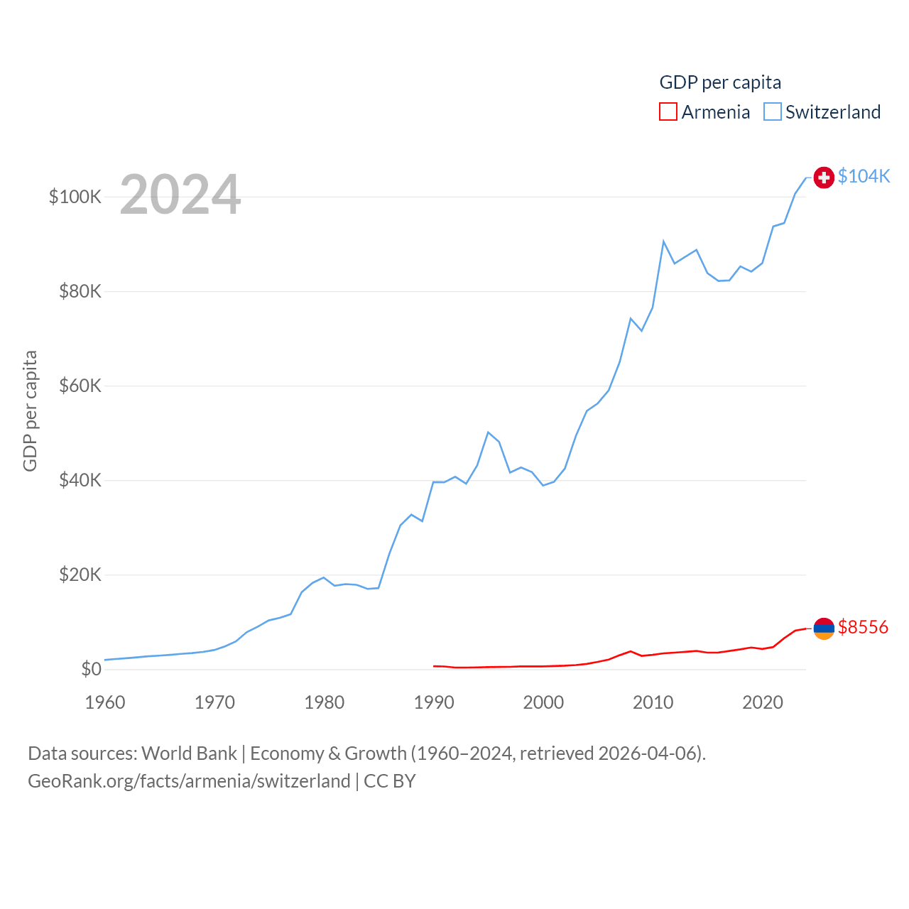 By GDP, Armenia ranks 114/197 ($26B) and Switzerland ranks 20/197 ($937B). By GDP per capita, Armenia ranks 90/197 ($8,556), while Switzerland ranks 5/197 ($103,998).