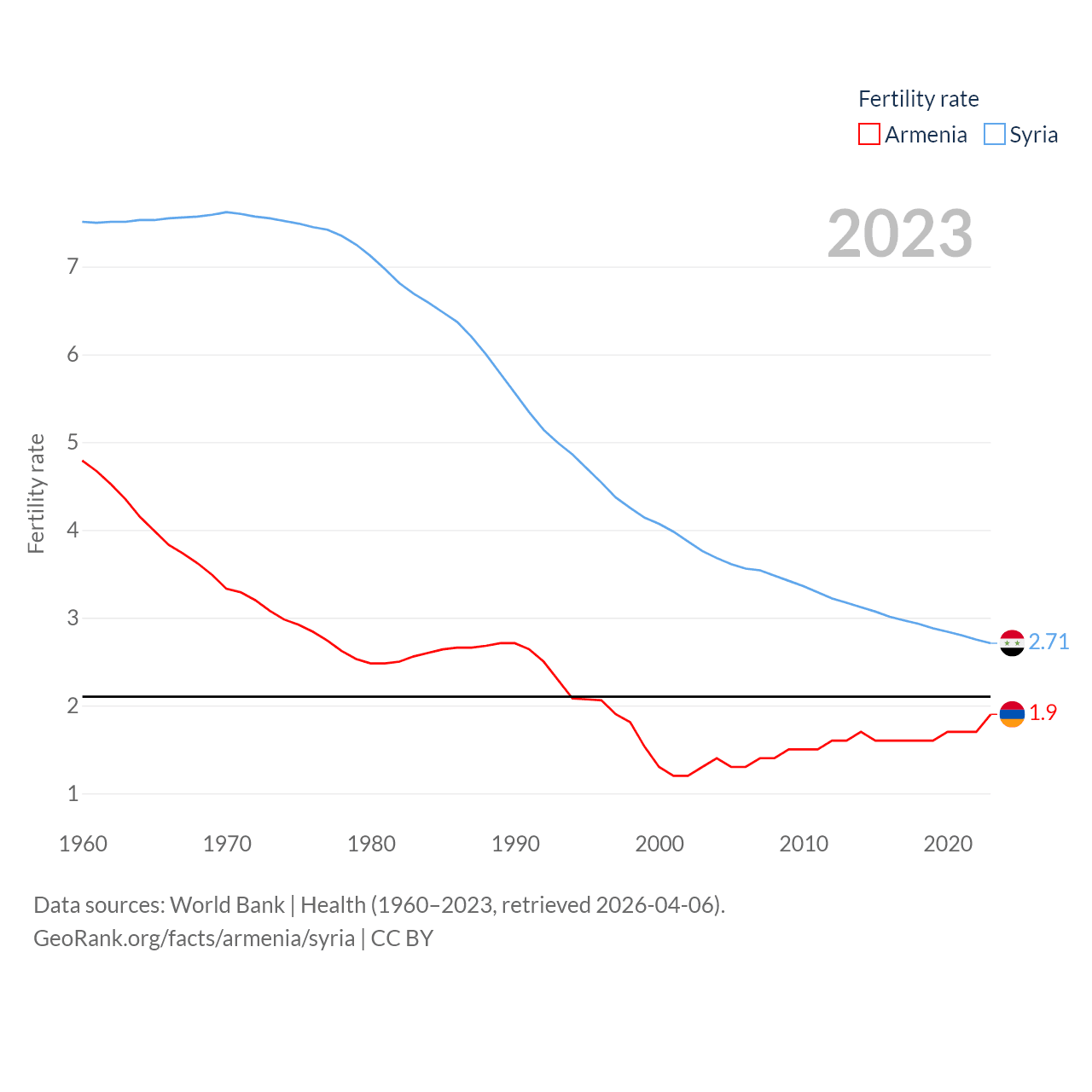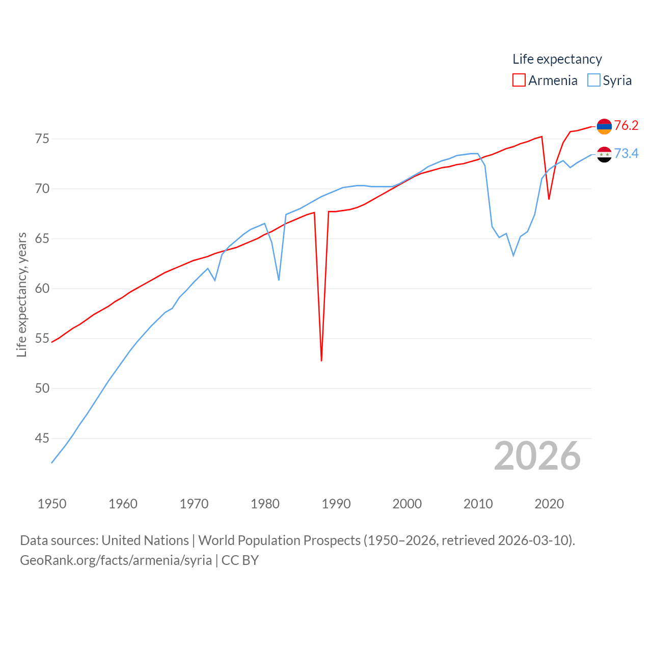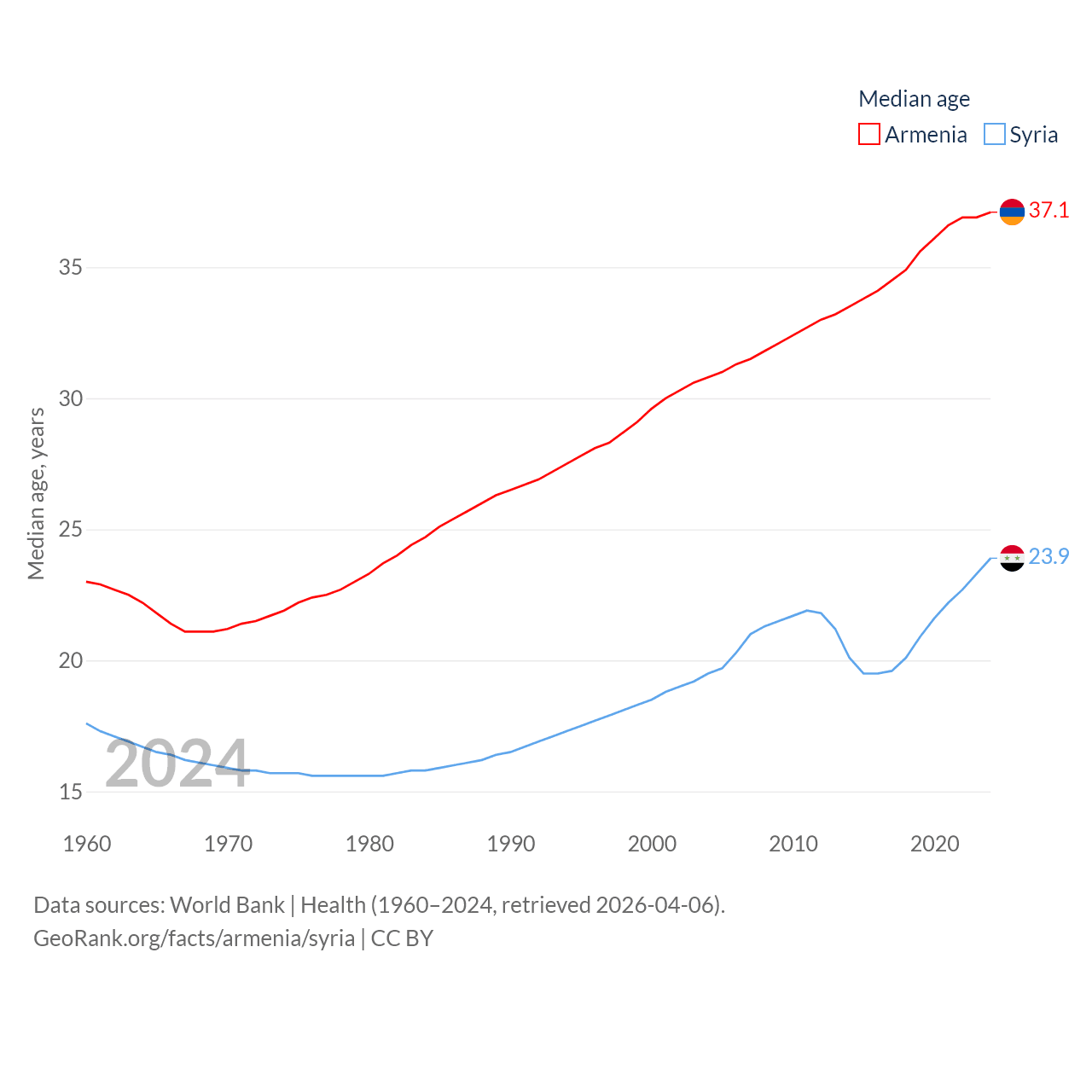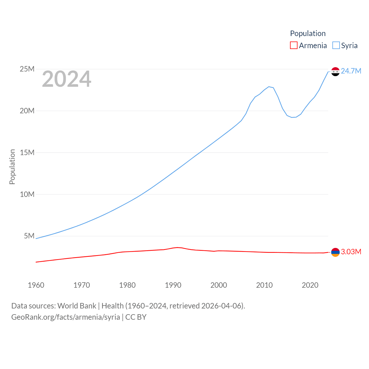 Armenia has a population of 3.03M (ranked 135/197), compared with 24.7M in Syria (ranked 57/197). Armenia's land area is 10,888 sq mi versus 70,900 sq mi for Syria (ranked 138th vs. 87th).