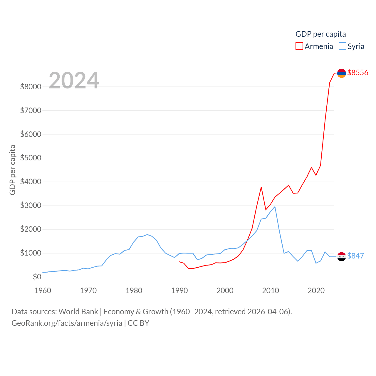 By GDP, Armenia ranks 114/197 ($26B) and Syria ranks 129/197 ($20B). By GDP per capita, Armenia ranks 90/197 ($8,556), while Syria ranks 185/197 ($847).