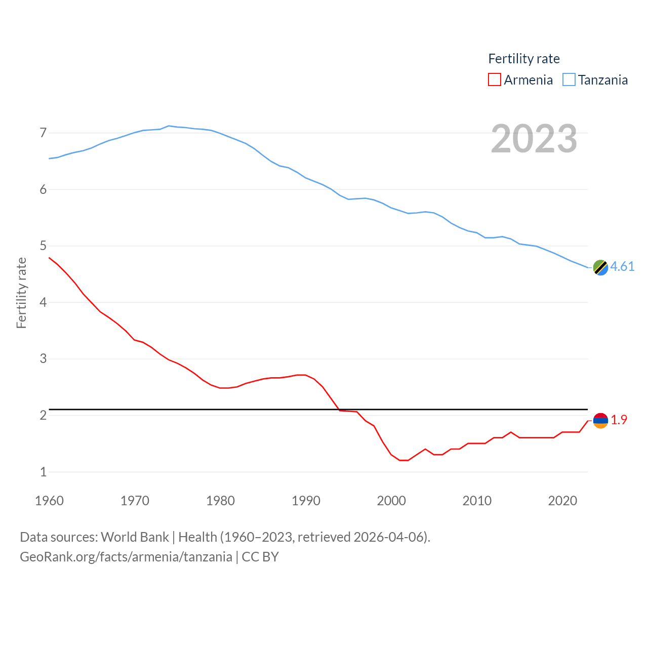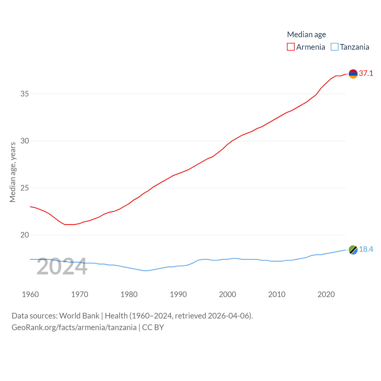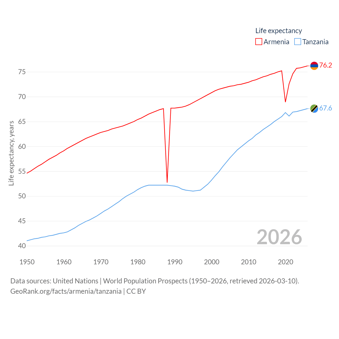 Armenia has a population of 3.03M (ranked 135/197), compared with 68.6M in Tanzania (ranked 22/197). Armenia's land area is 10,888 sq mi versus 342,009 sq mi for Tanzania (ranked 138th vs. 31st).