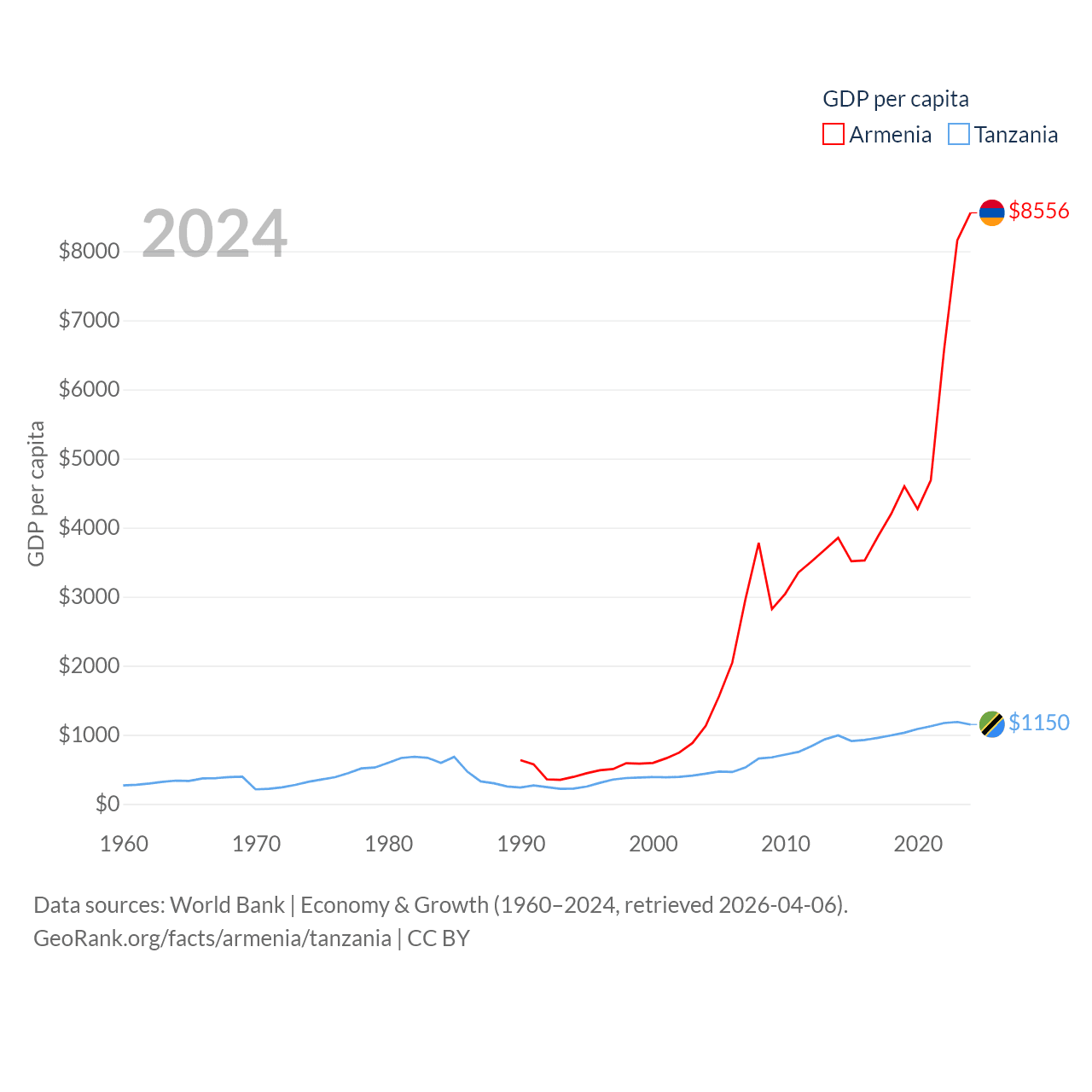 By GDP, Armenia ranks 114/197 ($26B) and Tanzania ranks 82/197 ($78.8B). By GDP per capita, Armenia ranks 90/197 ($8,556), while Tanzania ranks 170/197 ($1,150).