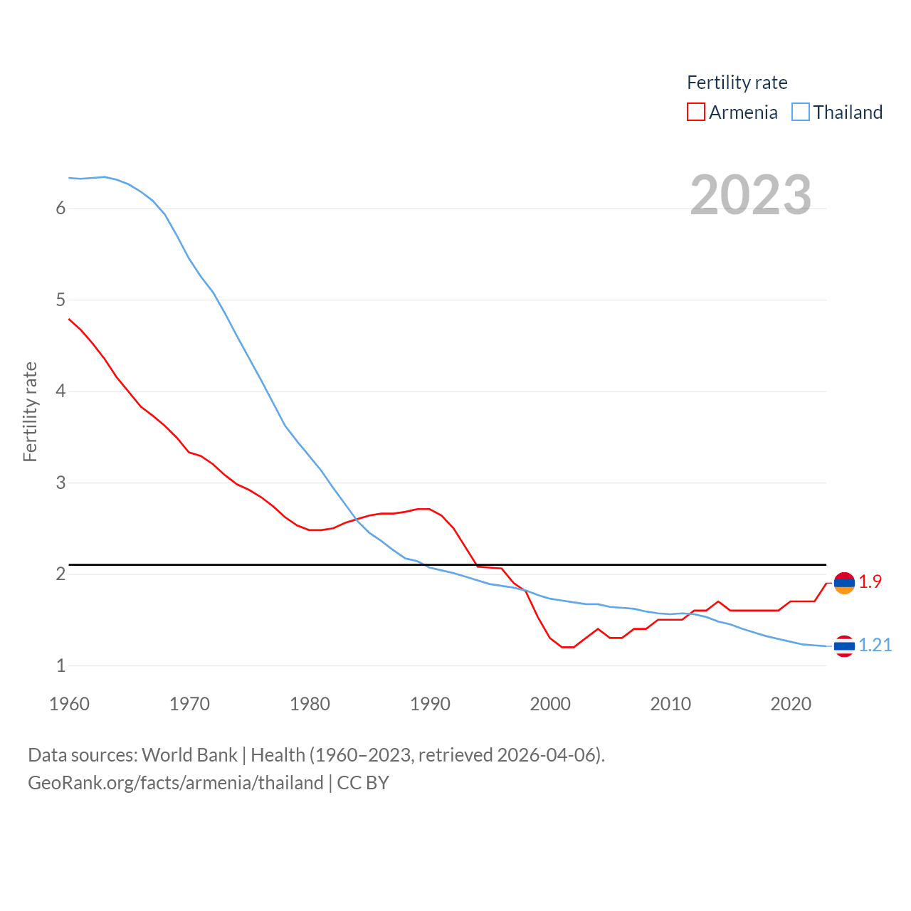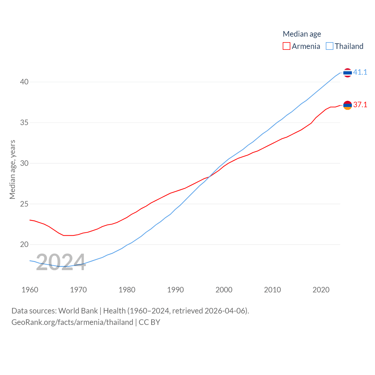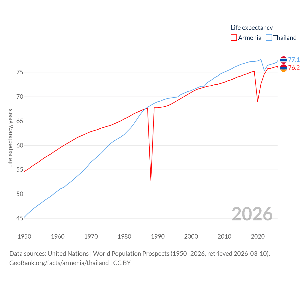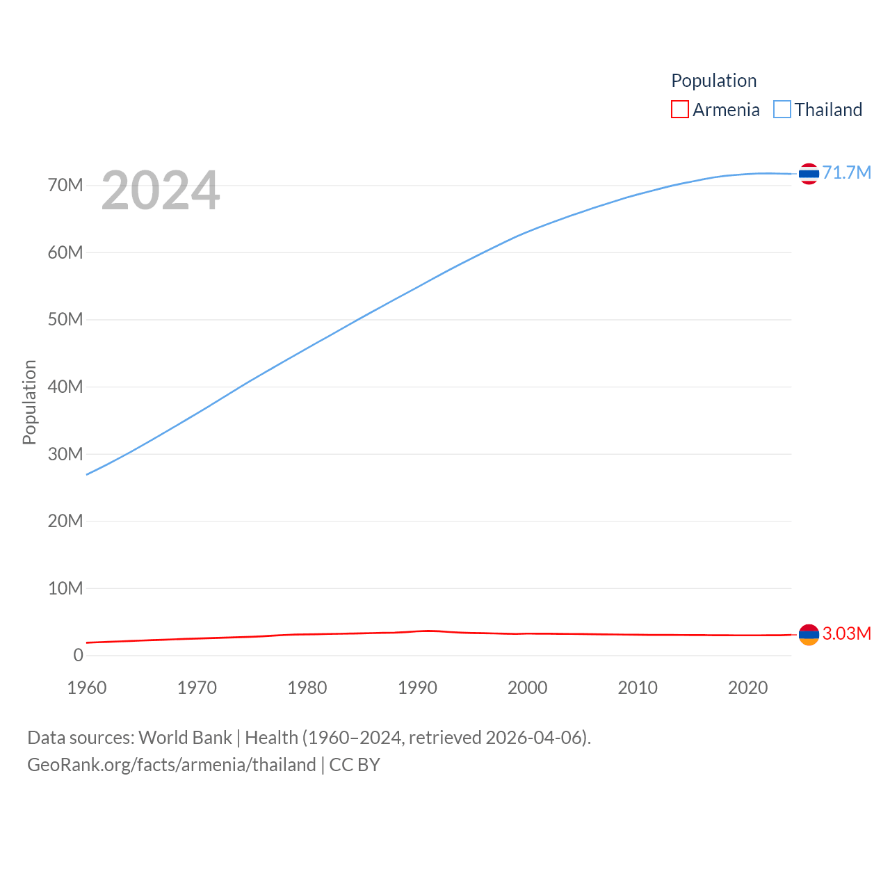 Armenia has a population of 3.03M (ranked 135/197), compared with 71.7M in Thailand (ranked 20/197). Armenia's land area is 10,888 sq mi versus 197,256 sq mi for Thailand (ranked 138th vs. 50th).
