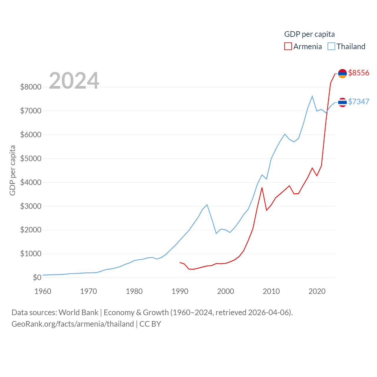 By GDP, Armenia ranks 114/197 ($26B) and Thailand ranks 31/197 ($527B). By GDP per capita, Armenia ranks 90/197 ($8,556), while Thailand ranks 100/197 ($7,347).