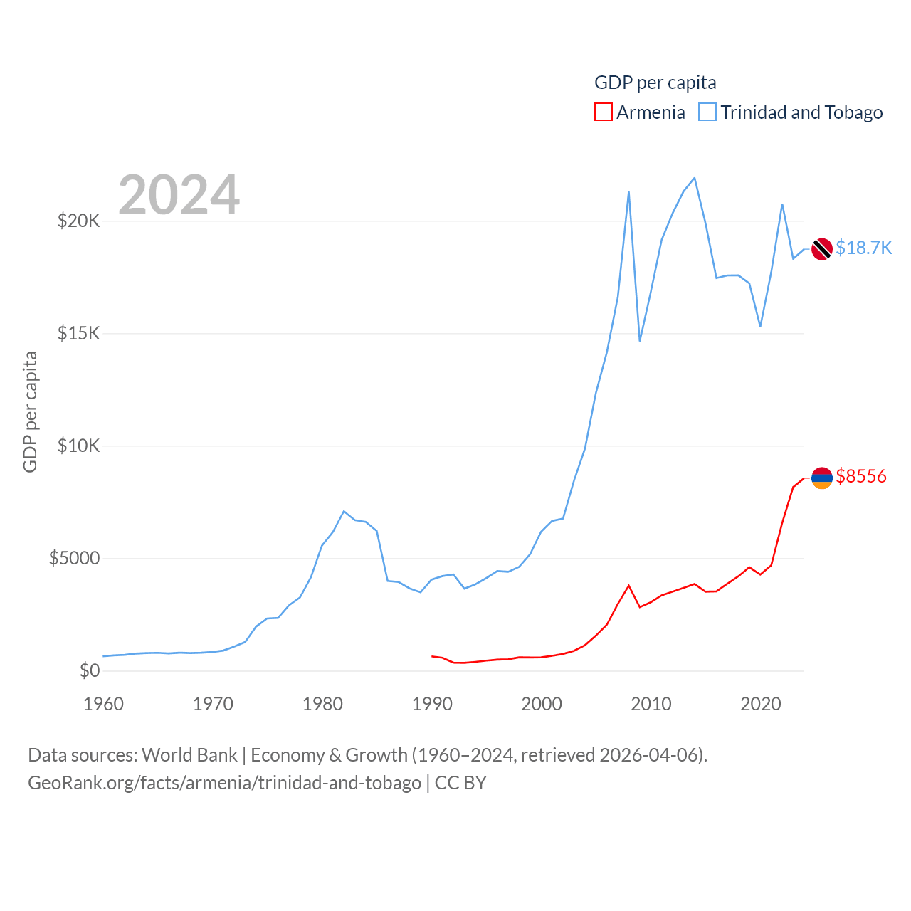 By GDP, Armenia ranks 114/197 ($26B) and Trinidad and Tobago ranks 115/197 ($25.6B). By GDP per capita, Armenia ranks 90/197 ($8,556), while Trinidad and Tobago ranks 61/197 ($18,733).