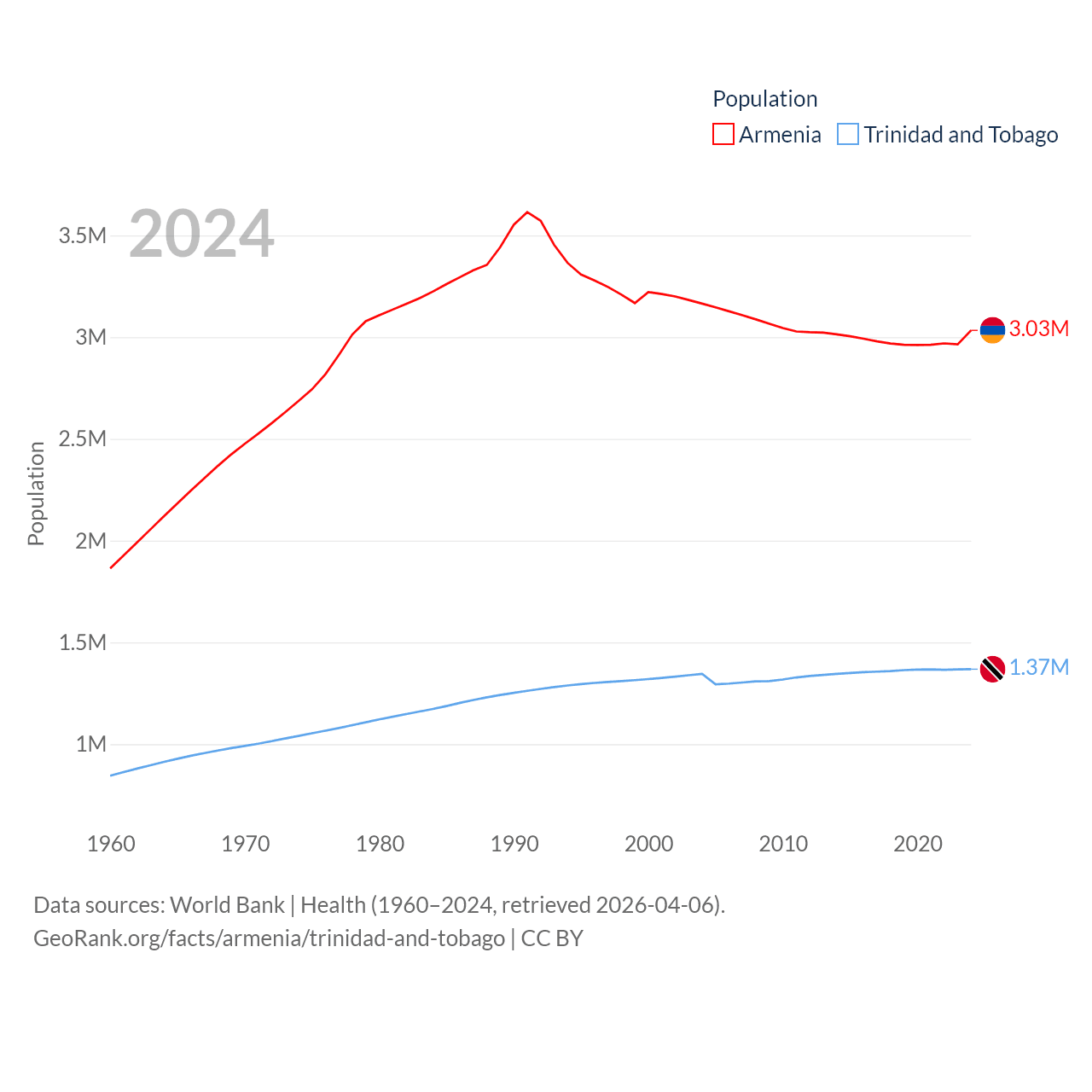 Armenia has a population of 3.03M (ranked 135/197), compared with 1.37M in Trinidad and Tobago (ranked 154/197). Armenia's land area is 10,888 sq mi versus 1,981 sq mi for Trinidad and Tobago (ranked 138th vs. 166th).