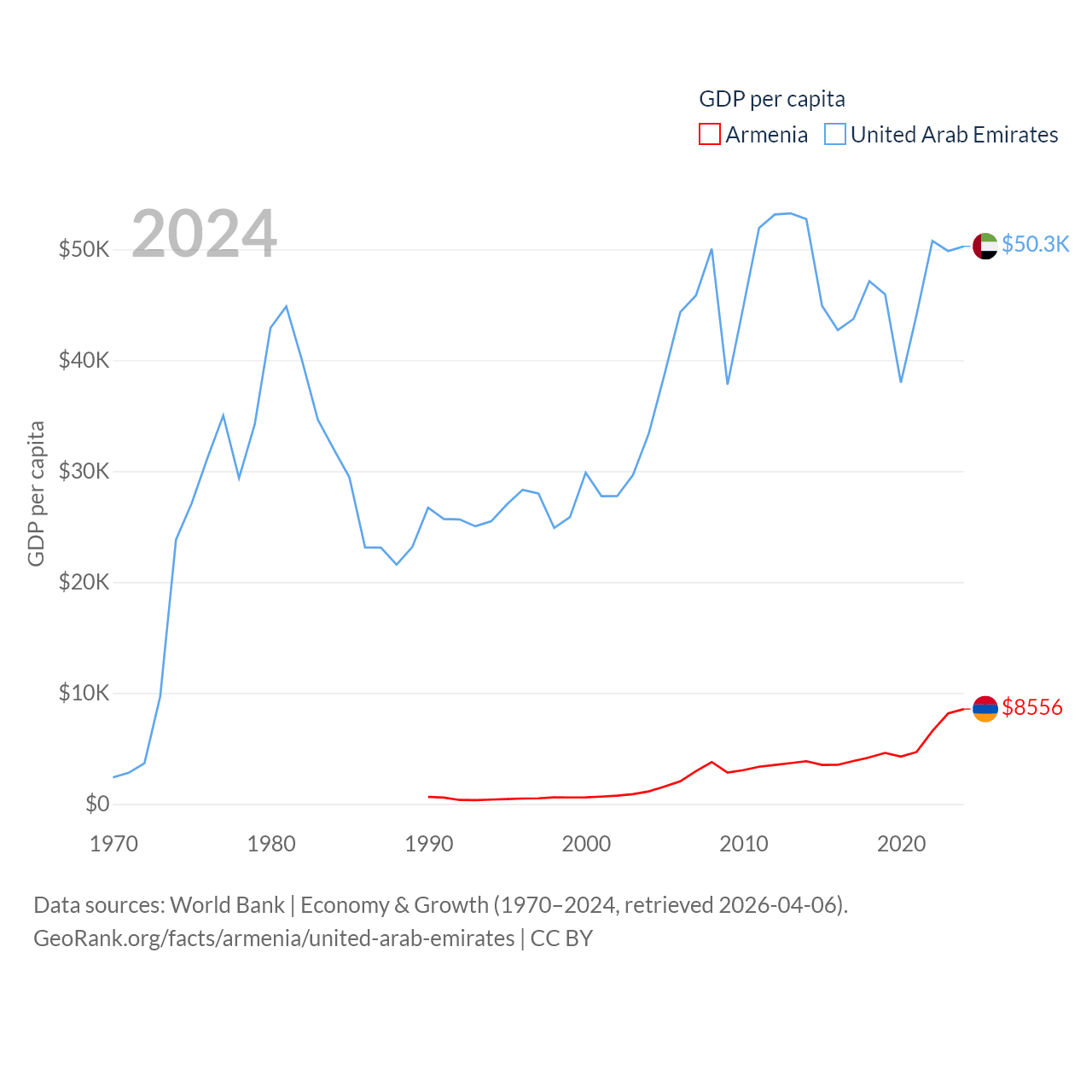 By GDP, Armenia ranks 114/197 ($26B) and The United Arab Emirates ranks 27/197 ($552B). By GDP per capita, Armenia ranks 90/197 ($8,556), while The United Arab Emirates ranks 24/197 ($50,274).