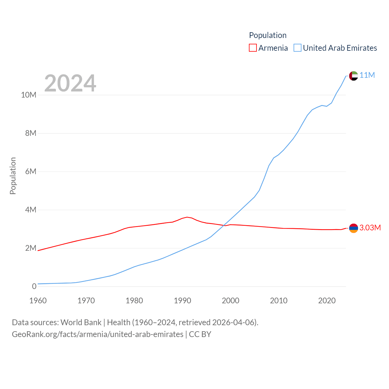 Armenia has a population of 3.03M (ranked 135/197), compared with 11M in The United Arab Emirates (ranked 86/197). Armenia's land area is 10,888 sq mi versus 27,421 sq mi for The United Arab Emirates (ranked 138th vs. 117th).