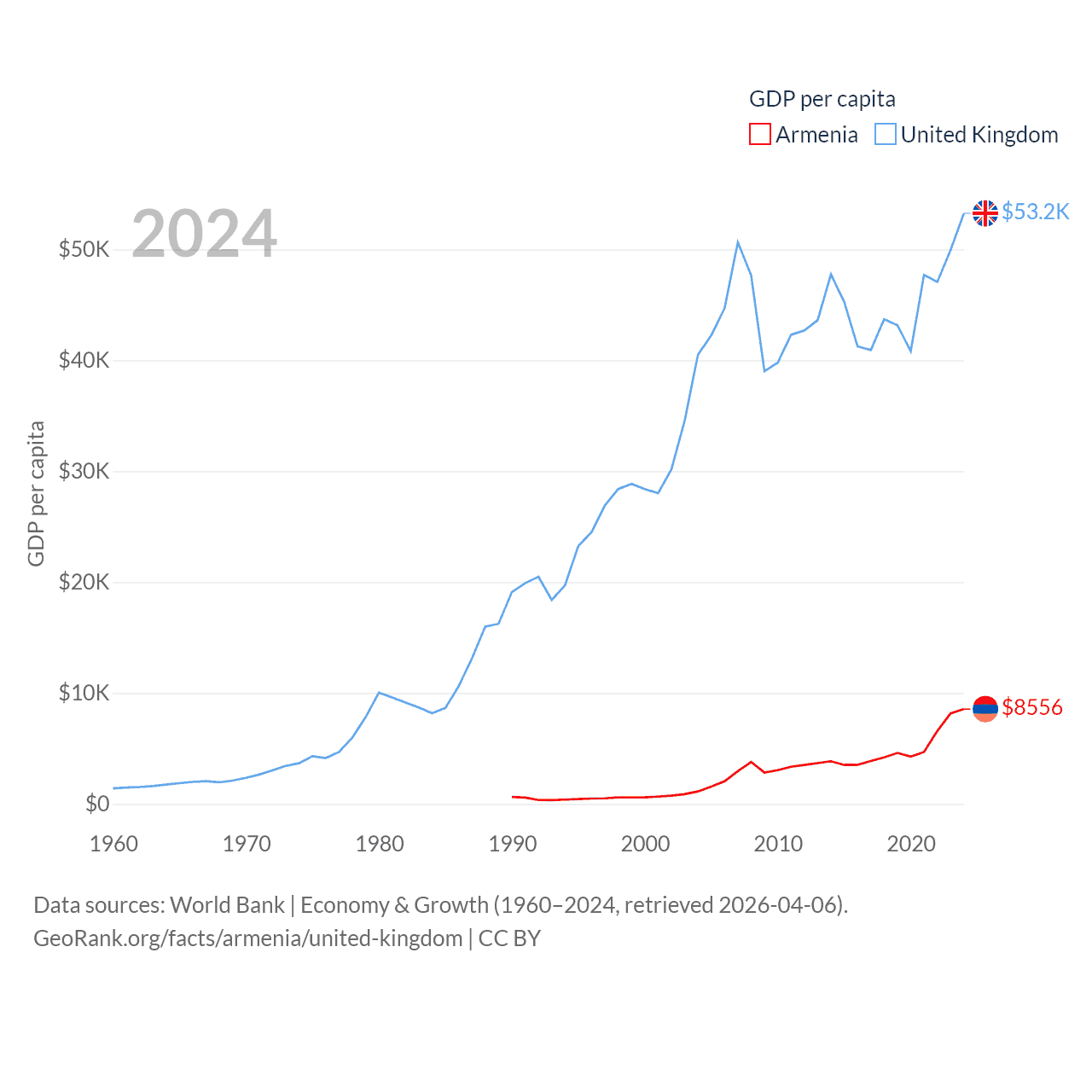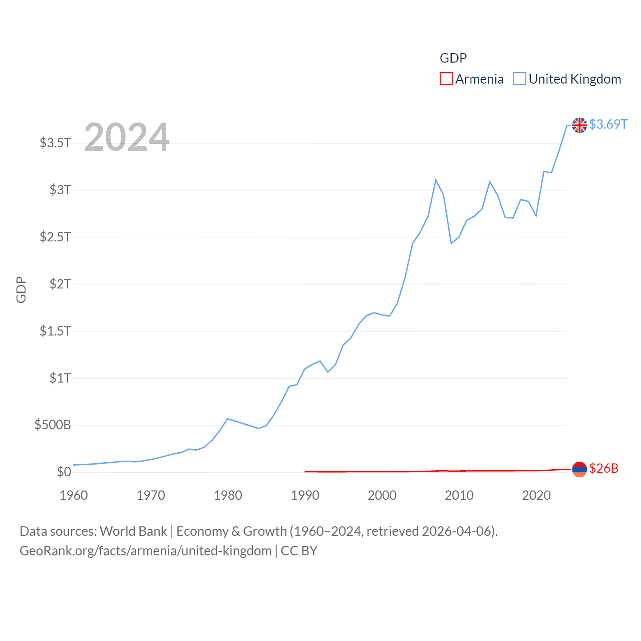 By GDP, Armenia ranks 114/197 ($26B) and The United Kingdom ranks 6/197 ($3.69T). By GDP per capita, Armenia ranks 90/197 ($8,556), while The United Kingdom ranks 22/197 ($53,246).