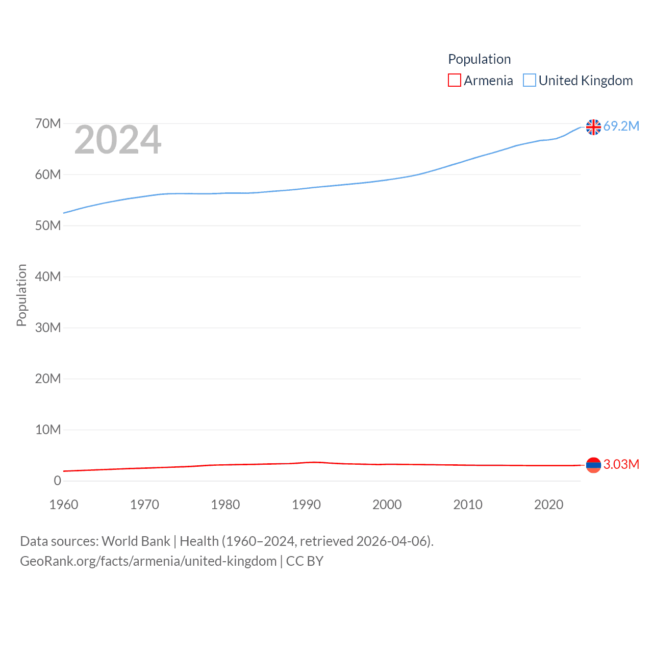 Armenia has a population of 3.03M (ranked 135/197), compared with 69.2M in The United Kingdom (ranked 21/197). Armenia's land area is 10,888 sq mi versus 93,410 sq mi for The United Kingdom (ranked 138th vs. 78th).