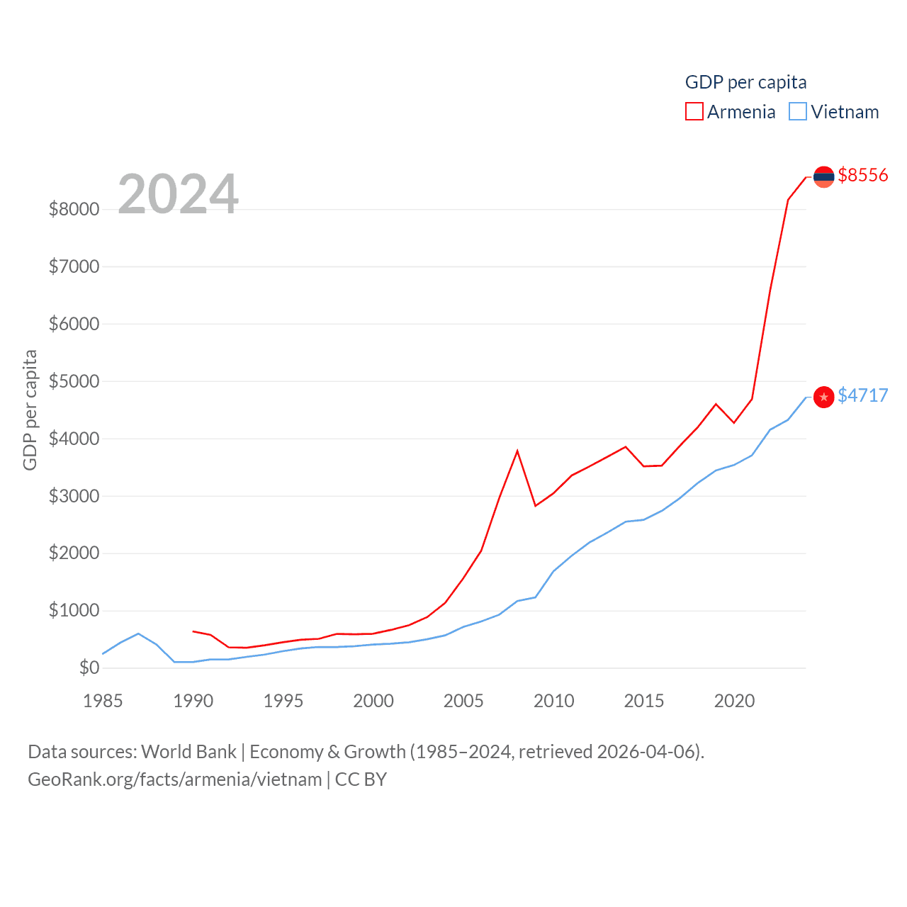 By GDP, Armenia ranks 114/197 ($26B) and Vietnam ranks 33/197 ($476B). By GDP per capita, Armenia ranks 90/197 ($8,556), while Vietnam ranks 122/197 ($4,717).