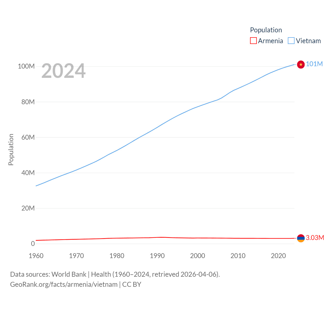 Armenia has a population of 3.03M (ranked 135/197), compared with 101M in Vietnam (ranked 16/197). Armenia's land area is 10,888 sq mi versus 121,016 sq mi for Vietnam (ranked 138th vs. 67th).