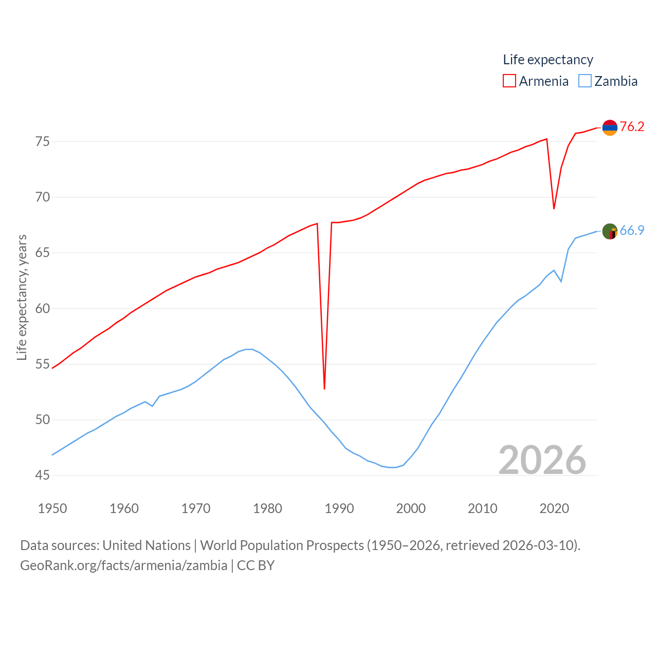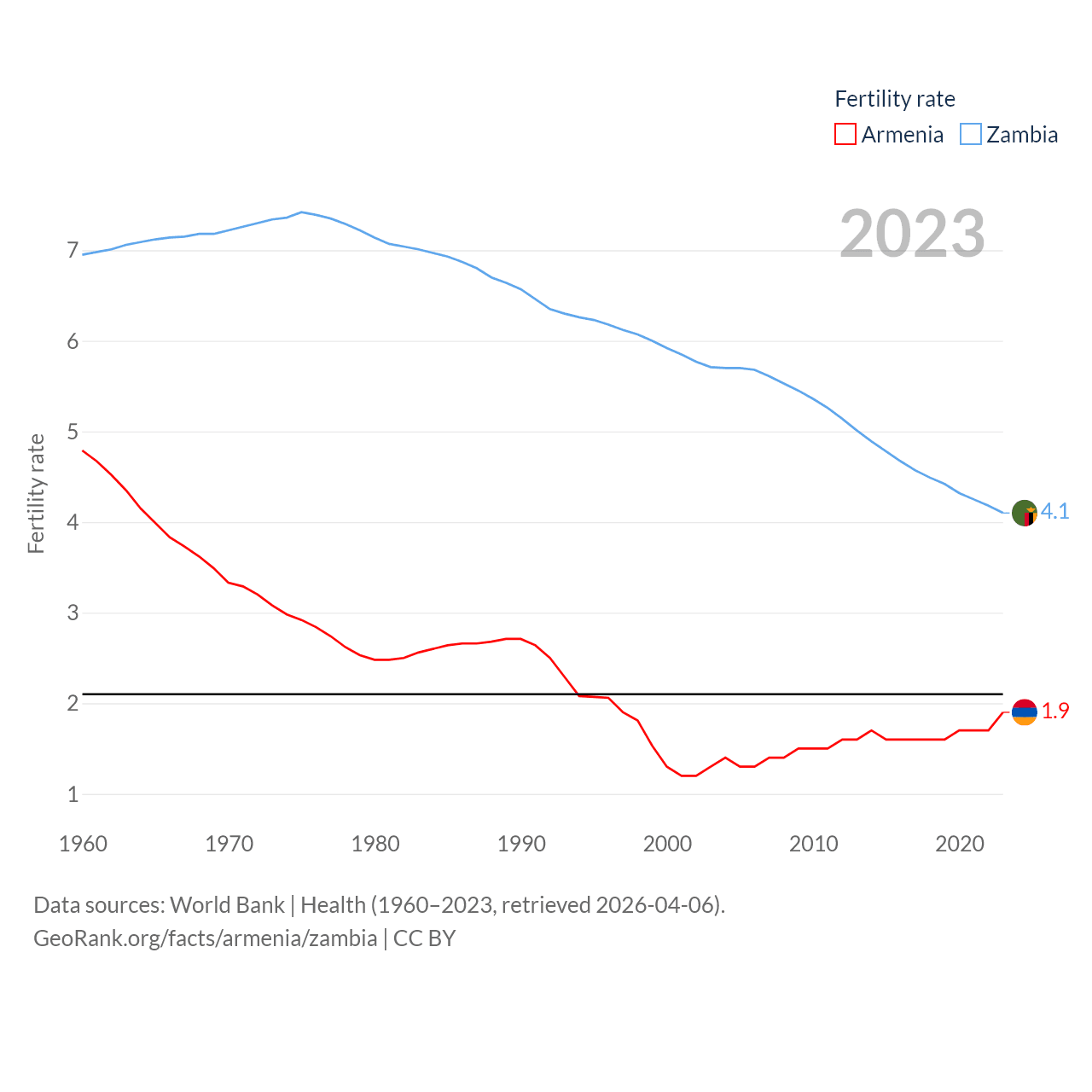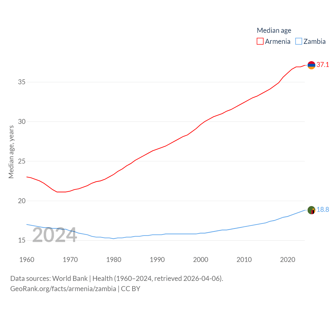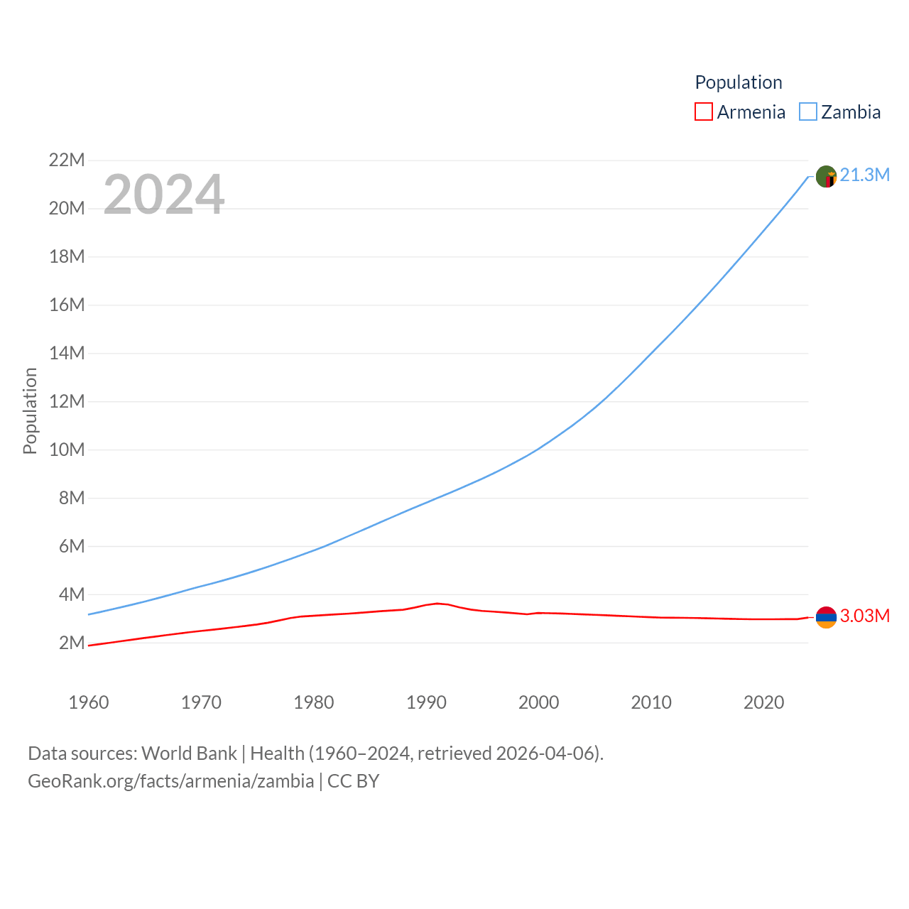 Armenia has a population of 3.03M (ranked 135/197), compared with 21.3M in Zambia (ranked 63/197). Armenia's land area is 10,888 sq mi versus 287,024 sq mi for Zambia (ranked 138th vs. 37th).